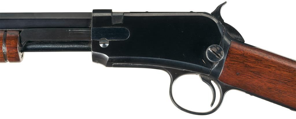 This is a beautiful example of a standard mid-production Winchester Model 90 slide action rifle as manufactured in late 1914, that is in just absolutely like new, all original condition. The rifle itself as noted is a standard mid-production 3rd model that has a very, very late 10th type barrel marking that was not introduced into the Winchester production line until January 1923. The Winchester markings are offset on the left side and read, "MADE IN U.S.A. WINCHESTER REPEATING ARMS CO. NEW HAVEN/CONN. U,S,A,. PAT. JUNE 26. 88 DEC. 6. 91 NOV. 27. 06. MAY 30. 1911" followed close by "---MODEL 90.---.22 W.R.F." The barrel has a radius muzzle not flat and is blued, which may indicate that this was a very late assembled rifle or one that was returned and refurbished by the factory in the mid to late 1920s. The barrel itself is fitted with standard late production sheet metal adjustable rear sight with the standard bead front sight. The top of the receiver ring and breech end of the barrel are both stamped with the circular "WP" proof mark. The rifle is fitted with an excellent straight grain, straight grip plain American walnut stock and standard American walnut 12 groove walnut pump handle. The barrel has the standard 3/4 length magazine tube. The very front edge of the receiver is correctly stamped "22 W.R.F." and the front underside edge of the receiver and rear area of the lower tang both carry the matching serial number of 533504A and 533504 respectively.