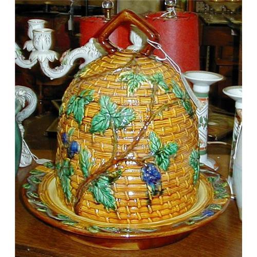 <table width="100%" border="0" cellspacing="0" cellpadding="4"><tr><td><em> </em></td></tr><tr> <td width="100%"> Large heavy Majolica Cheese bell amber with green leaves/blue grapes and brown handle. The bottom plate has crazing - it is bright yellow with majolica trim. The bell is 9" wide. First picture is more true to color. What a magnificent piece. Buyer pays shipping and handling costs. </td></tr><tr> <td> </td></tr><tr> <td>Reference #: B327_3609</td></tr><tr><td>Condition:good</td></tr><tr><td>Year:20th cent.</td></tr><tr><td>Country:Europe</td></tr><tr><td>Height:16</td></tr><tr><td>Width:14</td></tr><tr><td>Title:Fabulous Majolica Large Cheese Bell</td></tr><tr><td>Location:Hanover, Maryland</td></tr></table>
