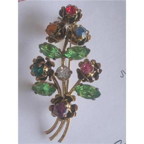 A very lovely vintage rhinestone brooch of Multi colour rhinestones in a very dimensional spray of flowers. Two layers of gold tone petals are around each stone which gives the brooch a very lovely 3-D look. The stones are foil backed in round and marquis shapes and the colour are just spectacular - deep red, pink, sky blue, golden yellow, sapphire color blue, amethyst color and kelly green. Measures 2" x 1" with safety close on the back and excellent condition.