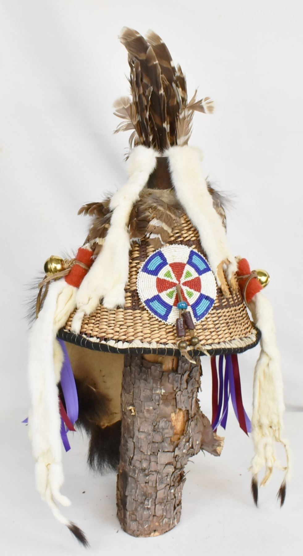 Fabulous Native American Apache Basket Hat, measures 16''L from top of feathers to bottom, embellished with turkey feathers, brass bells, felt, ribbons, and beads, 8 Ermine pelts, and bear fur, features a hand beaded medicine wheel, the basket is indicative of an Apache burden basket, felt lining