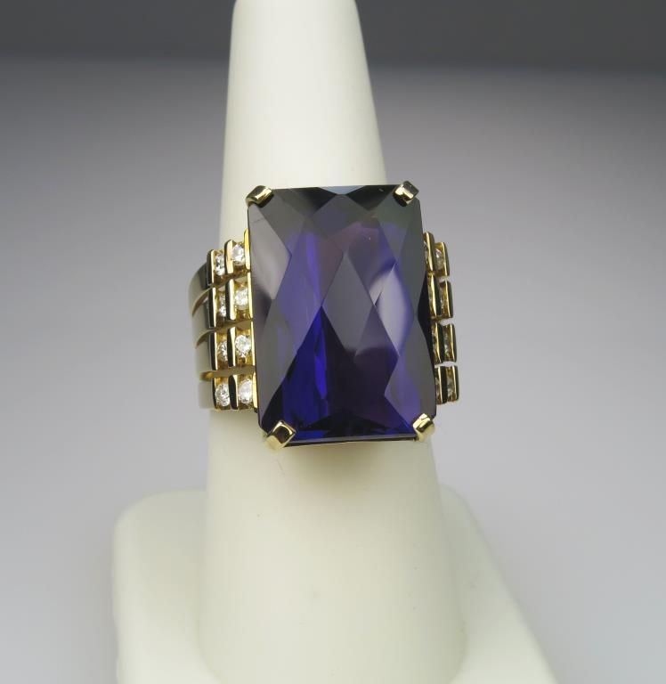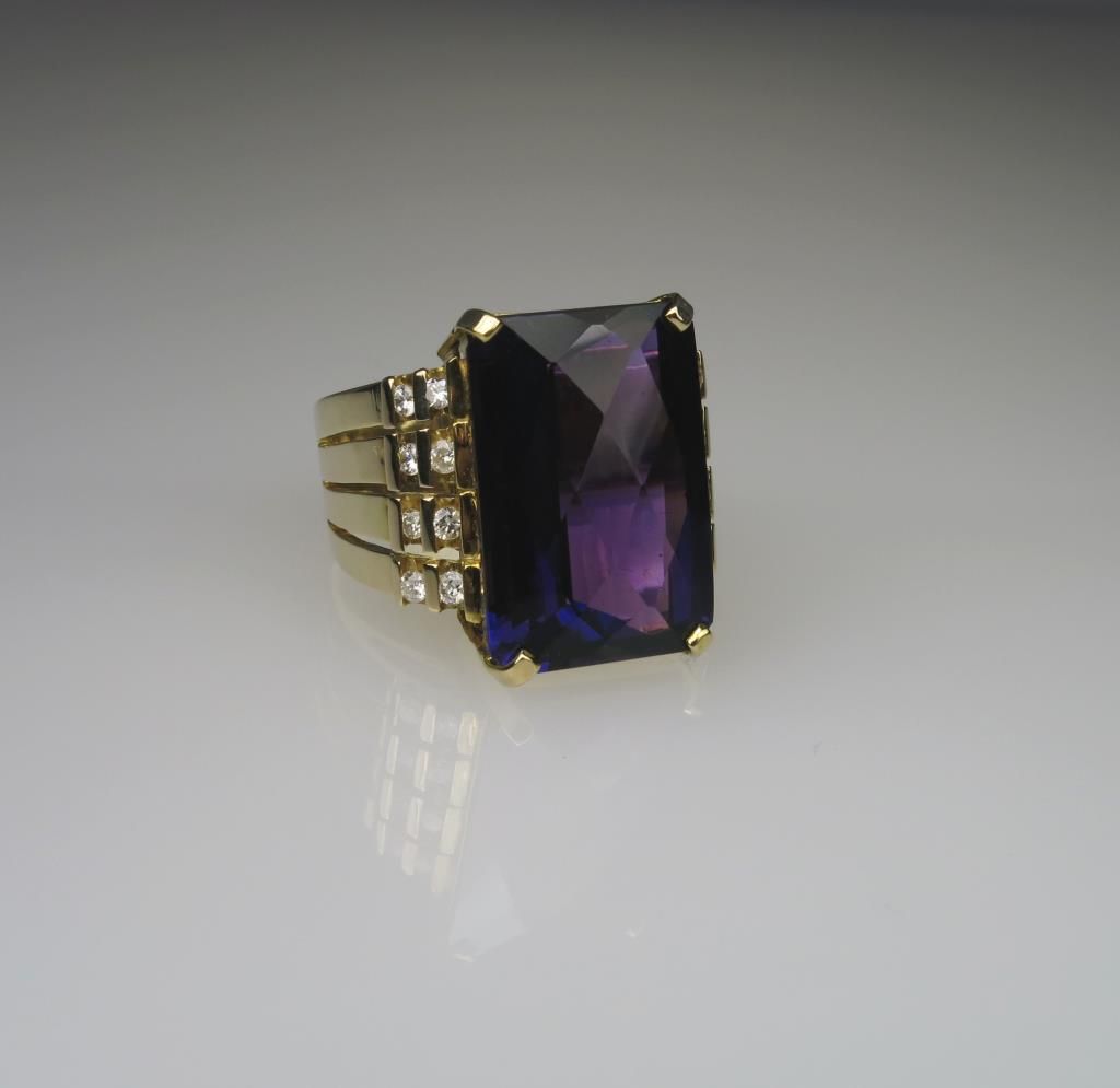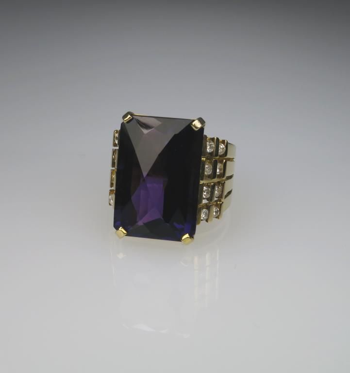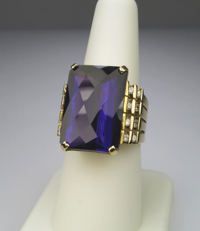 Fabulous One of a Kind Amethyst and Diamond Ring with approx. 30.00 carat rectangular shaped cushion cut Amethyst with FINE purple color and VS clarity accented by 16 round cut channel set Diamonds weighing approx. 0.50 carat with H-Icolor and SI clarity set in beautifully hand crafted 14 karat yellow gold setting. Collectors Piece. Retail $4,000-$5,000. Estimate $3,000-$4,000.