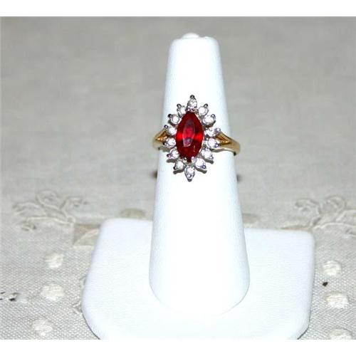 This wonderful Vintage 1950s Ring looks just like the real thing! Signed Sarah Coventry, its absolutely stunning. All Rhinestones are prong set with a large center Ruby Red faceted Glass Navette surrounded by bezel set white Diamond Cut Rhinestones, set in a heavy gold plating. In absolutely MINT, sparkling condition, measuring 3/4 inches long and 1/2 inches wide. Size 6 and very well made showing absolutely no plate wear even under loop! It looks just like the real thing, without the price...no one will know, except me and I'll never tell!