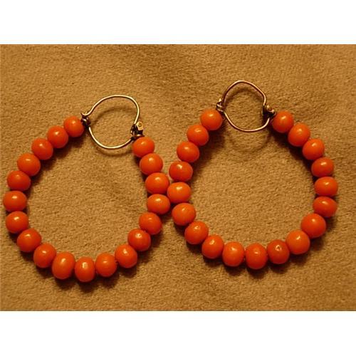 Lovely lady's Victorian Circa 1865 yellow gold and coral hoop earrings each set with 19 drilled roundish coral beads on gold wire - wonderful hard to find ANTIQUE EARLY EARRINGS!