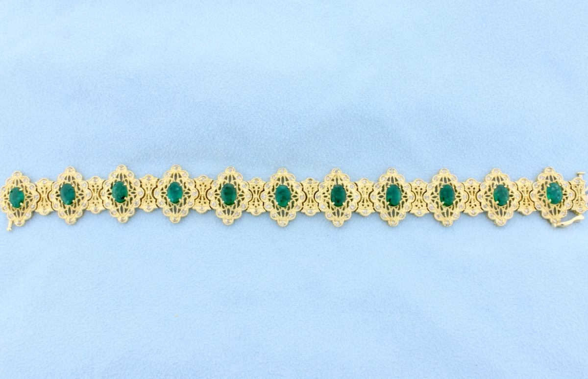14k Yellow Gold Bracelet featuring over 8 cts of oval shaped emeralds. Also contains 1.77 cts of diamonds (G to I color, I clarity). Amazing workmanship in this piece - reminiscent of European jewelry design from late 1980 Victorian Period. 7.5 inches long. Independent certification from AIG showing retail value of $14,400 included. 28.2 g