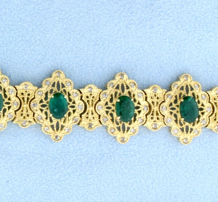 14k Yellow Gold Bracelet featuring over 8 cts of oval shaped emeralds. Also contains 1.77 cts of diamonds (G to I color, I clarity). Amazing workmanship in this piece - reminiscent of European jewelry design from late 1980 Victorian Period. 7.5 inches long. Independent certification from AIG showing retail value of $14,400 included. 28.2 g