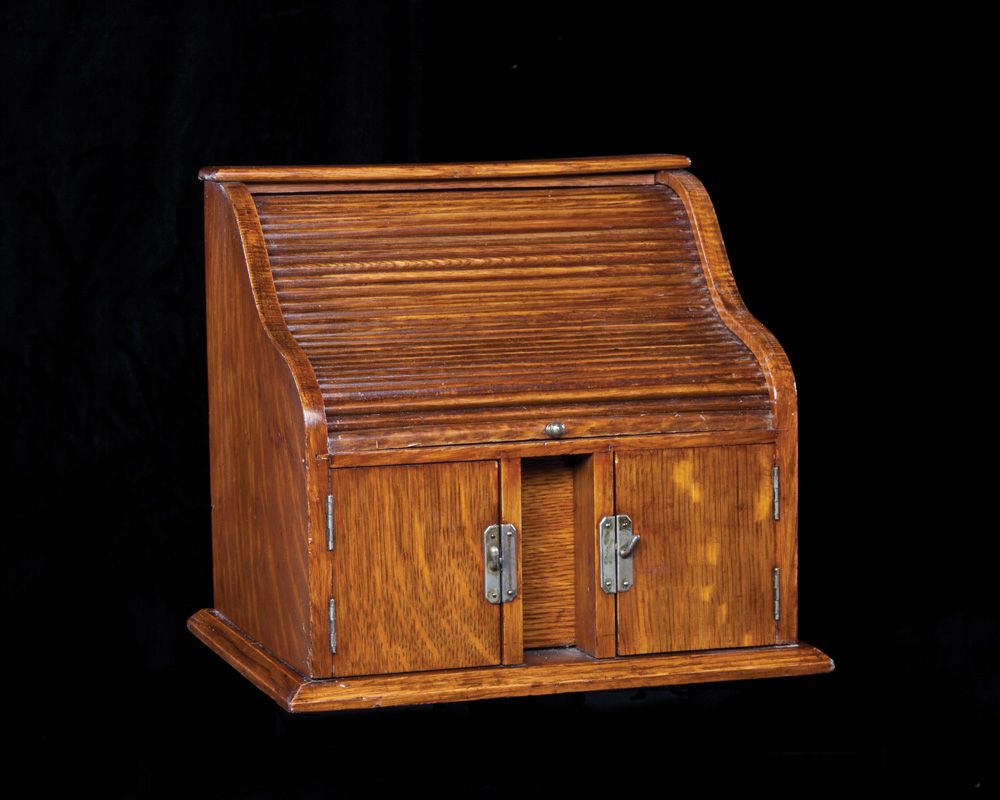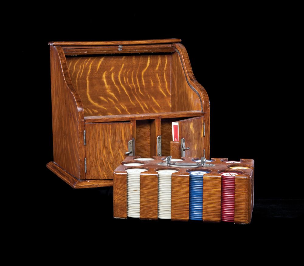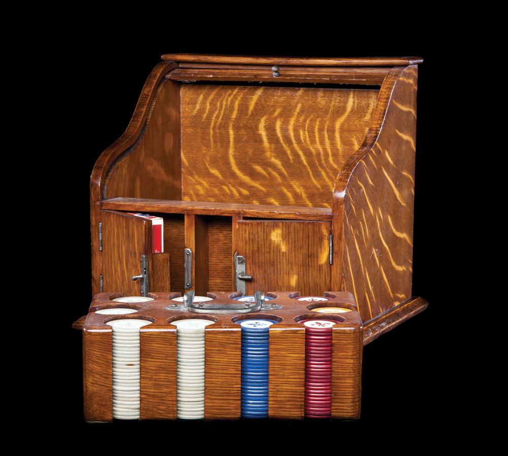 Constructed as a miniature S-curve roll top desk. 10” tall, 11” wide and 9” deep. Amazing attention to detail, roll the top up and expose the lift out fitted rack holding 250 chips in stacks of 25. The 2, hinged front doors are card holders. The chips included are composition with fleur-de-lis inlay, in red, white, blue and yellow.