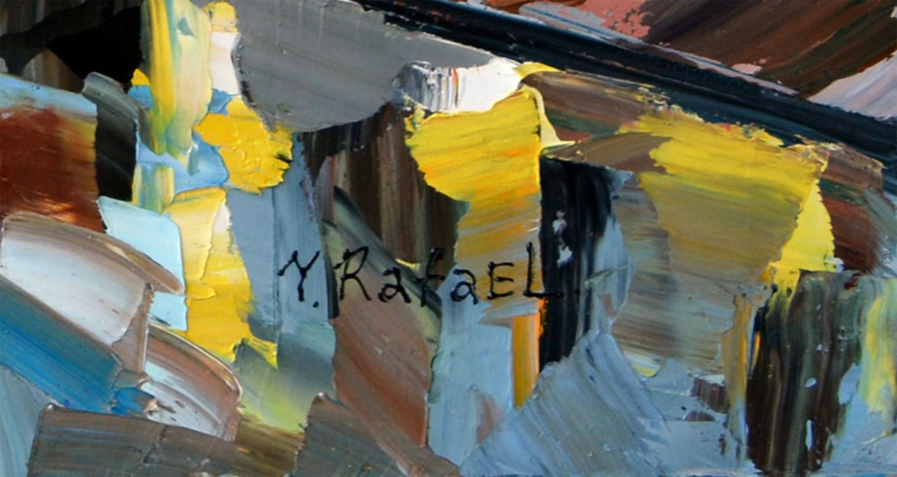Artist: Yana Rafael - Title: Paris Bike Ride - Medium: Acrylic on Canvas - Signature: Hand-signed by the artist at the bottom of the image - Image Size: Approximately 30 inches x 40 inches - Framed: Stretched and Ready for Framing - Details: This work comes with a Certificate of Authenticity - Yana Rafael's style is full of vibrant colors and expresses emotions typically associated with bold life. When violent colors are next to each other they trick the eye into a sensation of movement.