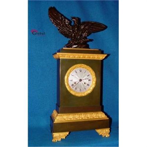 TAKE A MOMENT TO STAND BACK AND ABSORB THE BEAUTY OF THIS IMPRESSIVE BRONZE MANTEL CLOCK!We were lucky to acquire it from a high end private estate in the South of France near Cannes!The style of this fantastic clock is Empire and dates about 1870.This unique clock has four colours of bronze.The eagle on top is dark brown,the clock case is green with bronze gilt and the dial is silvered bronze.The clock has a 8- days movement and strikes the half and full hours on a bronze silvered bell.The clockwork is driving on a silk suspension.Perfect running and striking condition.If you have an eye for an unique piece that will give your home that one of a kind look,this is it !The dimensions are: Height:20,5 Inches,Width: 10 Inches and Depth: 5 Inches.No matter where you place this bronze mantel clock everyone will be begging to know where you got such an outstanding clock and where they can get one like it! Regarding shipping we will pack the clock in a wooden crate so you will receive it without any damage. Shippingscosts to the U.S.A. are 160 $ US. After payment you will receive the clock in about 4 days.We sold many Empire clocks the last years, but this one is a very special clock, that we have never seen in such a high worth quality !!The rustic charm of this lovely clock represents a note of distinction in every home.Thank you for looking this marvelous mantel clock.Sincerely,Wil Tegenbosch,Global Antiques Holland.