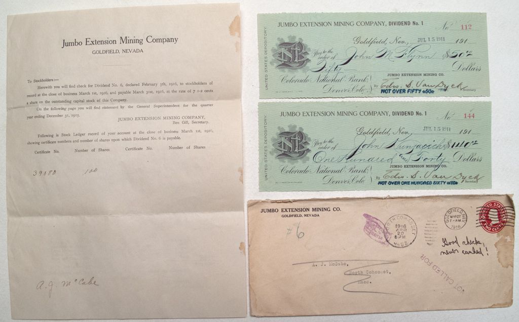 Four items. 1) 1916 stock holder letter. 2) 1916 envelope for letter. Cancelled Goldfield with a Jumbo Extension Mining Co. cover advertising. 3-4) Two checks issued to two different people on July 15, 1911 that were never cancelled. Checks were for the first dividend the company issued. One is for $50.00 and the other for $140.00