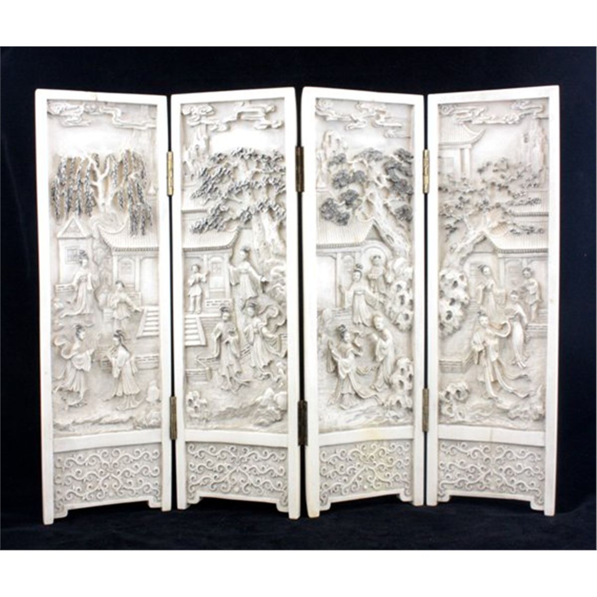 Carved scenes & etched design en verso. Approx. 14.75" H, each panel 4.5" W. Please read our terms of sale.