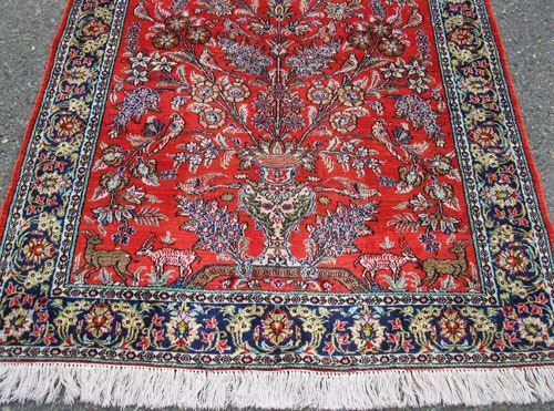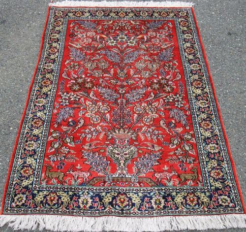 Fabulous rare tree of life design fine Persian silk Qum. 100%natural, hand woven, vegetable dye. Pure silk pile on silk foundation. Qum is known as the birthplace of the finest silk rugs of Iran. These fine pieces have not only the finest weave but also the most exquisite design and dazzling color combination. this is best understood and appreciated when one becomes aware of the fact that Qum lies at the edge of the desert, surrounded by harsh environment and barren desert land. Qum rugs therefore become the centerpiece and source of charm and joyfulness in the house and the living quarters. This lovely piece is masterfully hand woven, knot by knot, and has over 2230 knots per square inch. it would take a master weaver well over two years to create this beauty. This wonderful rare tree of life design silk Qum is adorned with a charming collection of bird and animals. Size: 5 feet X 3 feet 3 inches. Country of origin: Iran.