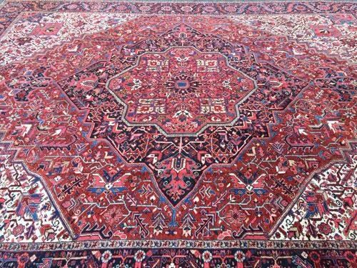 Fabulous signed Persian Serapi by master weaver Rumi. 100%natural, vegetable dye, hand woven, superior quality baby lamb's wool pile on cotton foundation. Born out of an expressive and creative culture, is where this wonderful Heriz-Serapi captures its essential qualities of design, color, texture and artistic genius. This is a dynamic and exciting mid-century Persian carpet in mint condition. at the same time, it is a uniquely bold and brightly vintage piece. Heriz-Serapi’s are prized for their authenticity, that is, they are made by the natives for the natives, featuring bold geometric designs along with bright, lively and happy colors. Moreover, the hand spun superior quality baby lamb's wool gives this lovely piece an endearing and appealing texture that is unique and unparalleled. The symbols and motifs incorporated in the pattern are influenced by weaver's everyday life experiences, representing prosperity, fertility, cultural and religious beliefs. It is intriguing when one is reminded of the fact that Heriz-Serapi, a tiny town in the northwestern part of Iran, is the birthplace of a rug with such dazzling beauty. It becomes even more astonishing when one is reminded of the fact that, these pieces are woven by artisans with very little education if any at all. It is in that context that one would appreciate even further such striking beauty with rich colors and captivating patterns. This large and fascinating piece has been woven by a renowned master weaver named "Rumi" and it is signed in the rug. Where a typical Persian rug is limited to twelve and sixteen colors, this charming piece features more than forty eight different colors, creating an astounding tapestry of colors that is a feast for the eyes. This masterpiece can transform any living space into a fabulously inspired interior. It is noteworthy that, Heriz-Serapi of this particular size (15X12) is a rarity in the marketplace. Size: 15 feet X 12 feet. Country of origin: Iran.