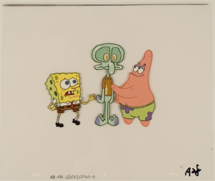 This original animation cel is from the Nickelodeon TV show SpongeBob Squarepants. The story takes place under the deep blue sea in Bikini Bottom, where SpongeBob resides. SpongeBob, who is a yellow, porous sponge, is your typical happy-go-lucky character, as he is always cheerful and enjoys making people laugh. Patrick Star, SpongeBob's neighbor who is a starfish, is your average children's show idiot, as he boasts knowing nothing and is often getting himself into ridiculous situations. Between the homes of these two lies the home of the miserable Squidward, a squid, who is known for being grouchy and playing tricks on SpongeBob and Patrick. Both SpongeBob and Squidward work at the Krusty Krab, a fast food business run by the greedy money-loving Mr. Krabs, a crab, the arch rival of the evil, possibly misunderstood, Plankton. Another neighbor, Sandy Cheeks, an athletic squirrel who normally wears an astronaut's space suit, was introduced in "Tea at the Treedome." She spends most of her time inventing and experimenting. Why is Squidwards face smashed?Original Production Animated Cel Overall Size of Cel: 10 1/2" x 12 1/2" Very Good ConditionThis is an original hand-painted cel set-up used in the production of an episode of "SpongeBob SquarePants." Each one-of-a-kind set-up represents a slight change in position of the characters. When individually photographed and projected in rapid succession, the images appear to move.