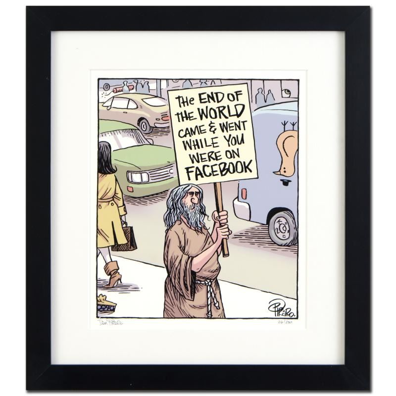 Enter a surreal and satirical world of twisted imagination and award winning creativity. "Facebook Prophet" is a limited edition giclee on paper by Dan Piraro, creator of the critically acclaimed and award winning comic strip, Bizarro! This piece is framed, numbered and hand signed by the artist! Includes Certificate of Authenticity! Measures approx. 17" x 19" (with frame), 9.5" x 11.5" (image).