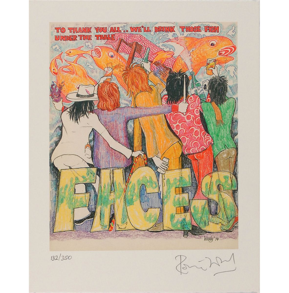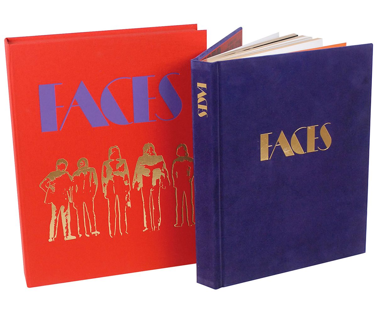 Signed book: Faces. First edition. Guildford, England: Genesis Publications, 2011. Deep purple suede hardcover in a custom case, 10.25 x 13, 272 pages. Signed on a bookplate affixed to the colophon by Ronnie Wood, Kenney Jones, and Ian McLagan. The signed color Ronnie Wood print is also included. Edition is housed in its cloth bag and original shipping box. In very fine condition.