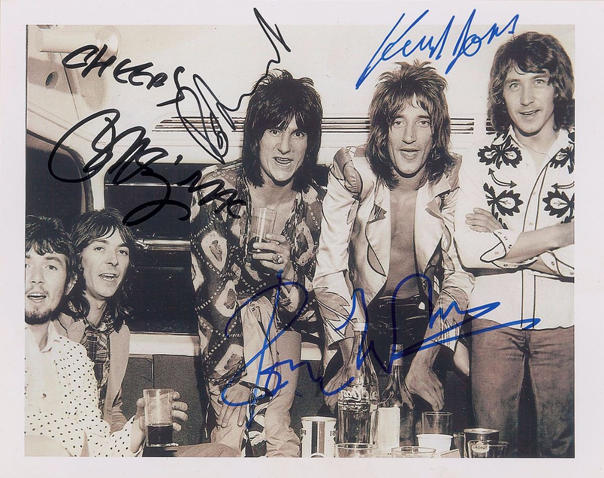 Glossy 10 x 8 group photo of Faces enjoying some beverages, signed in black felt tip, “Cheers, Ian McLagan, MAC” and “Rod Stewart,” and in blue felt tip, “Ronnie Wood” and “Kenney Jones.” In fine condition.