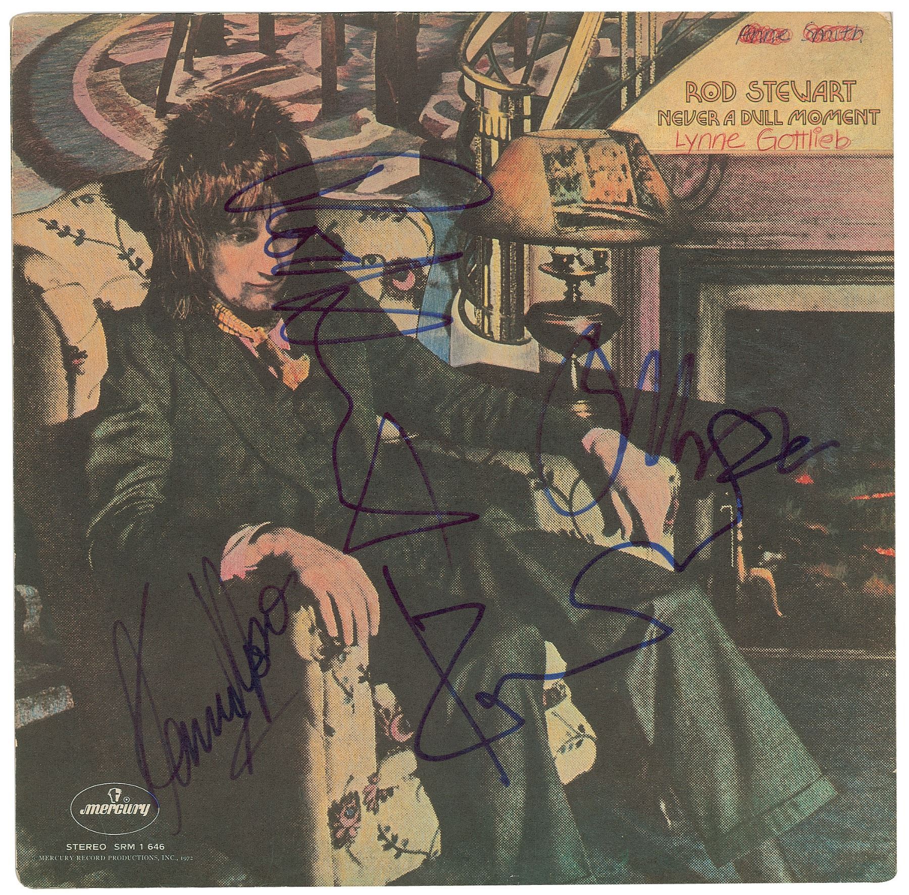Never a Dull Moment album by Rod Stewart, signed on the front cover in blue felt tip by Stewart, Ronnie Wood, Ian McLagan, and Kenney Jones. In fine condition, with two ownership notations in the upper right corner. The record is included.