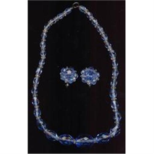This wonderful set is made of cornflower blue faceted crystal beads. The clip earrings have added clear beads for a delightful look. The beads on the necklace are egg shaped in graduated sizes with tiny white spacer beads in between. The necklace measures 15 1/2 inches long. It fastens with the old plunger type clasp. The earrings are silvertone metal clips measuring 13/16ths inches tall. Both pieces are in very good condition. I don't see any markings.