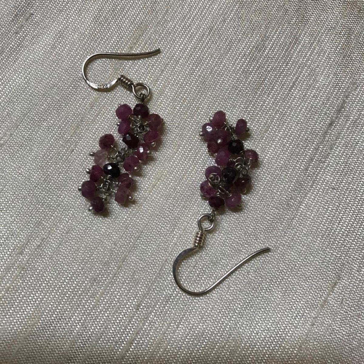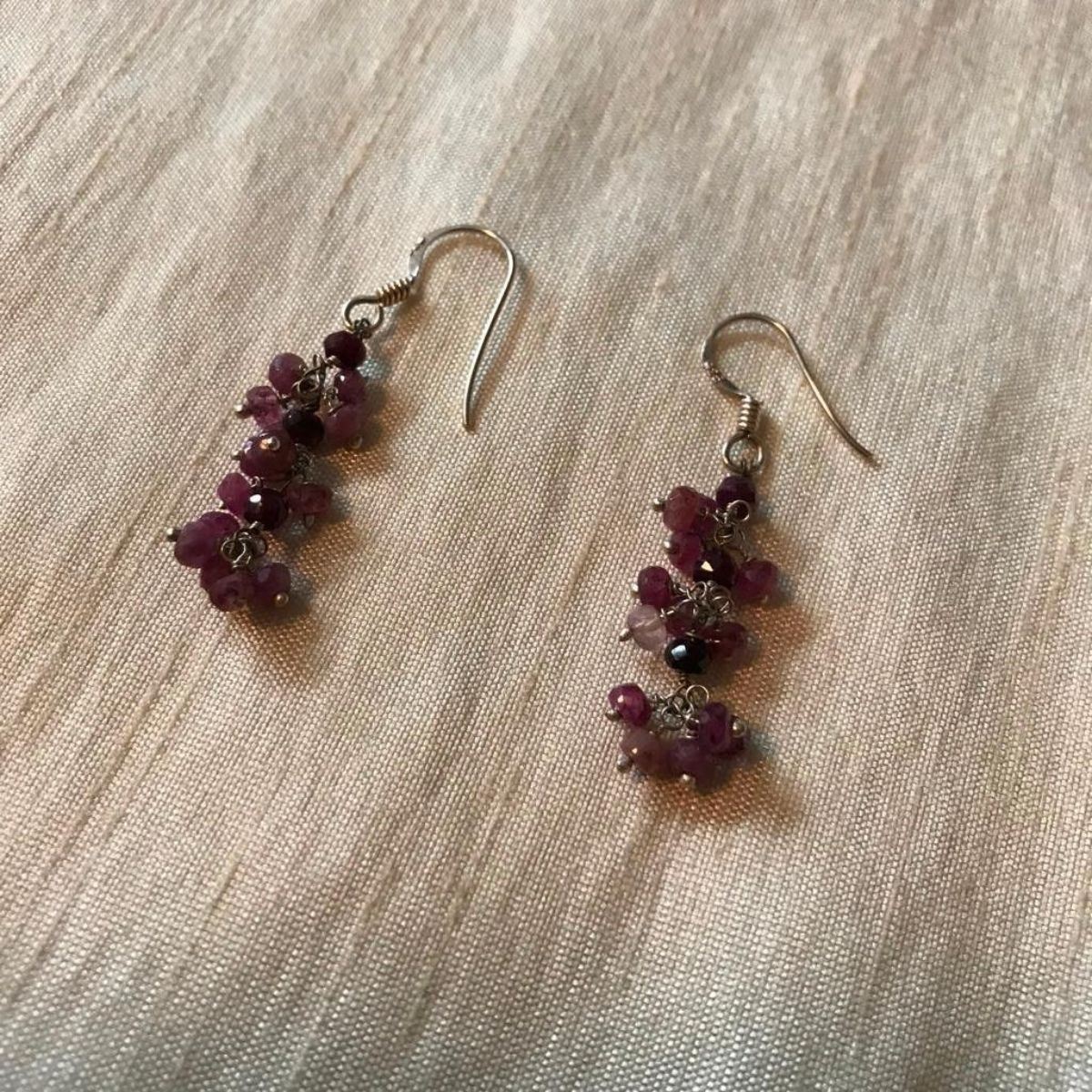 Tiny round faceted natural ruby beads ( 2mm ) in shades of light pink to dark, wrapped with sterling wire to created unique cluster dangle hook style earrings. Sterling silver 925 stamped hooks. 1 3/4" L each.