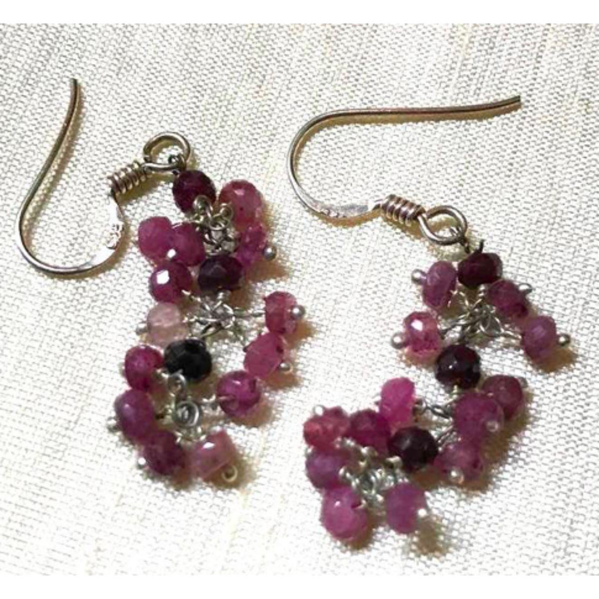 Tiny round faceted natural ruby beads ( 2mm ) in shades of light pink to dark, wrapped with sterling wire to created unique cluster dangle hook style earrings. Sterling silver 925 stamped hooks. 1 3/4" L each.