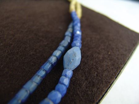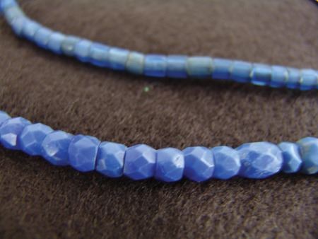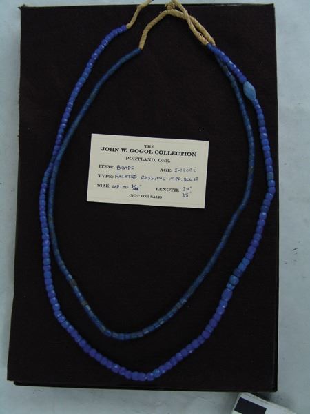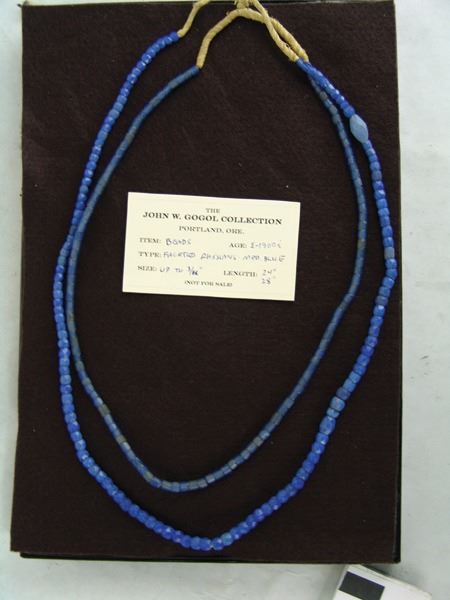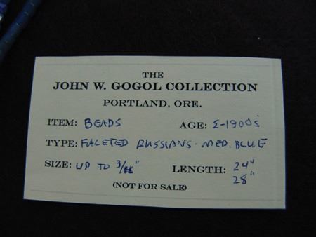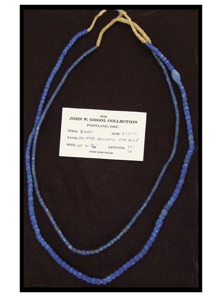 Ca. 1900s, Two strands of fine faced "Russian blue" trade beads in medium blue, the larger graduated and with mostly the rare round example. Very good condition. Ex. John Gogol collection. 24", 28"