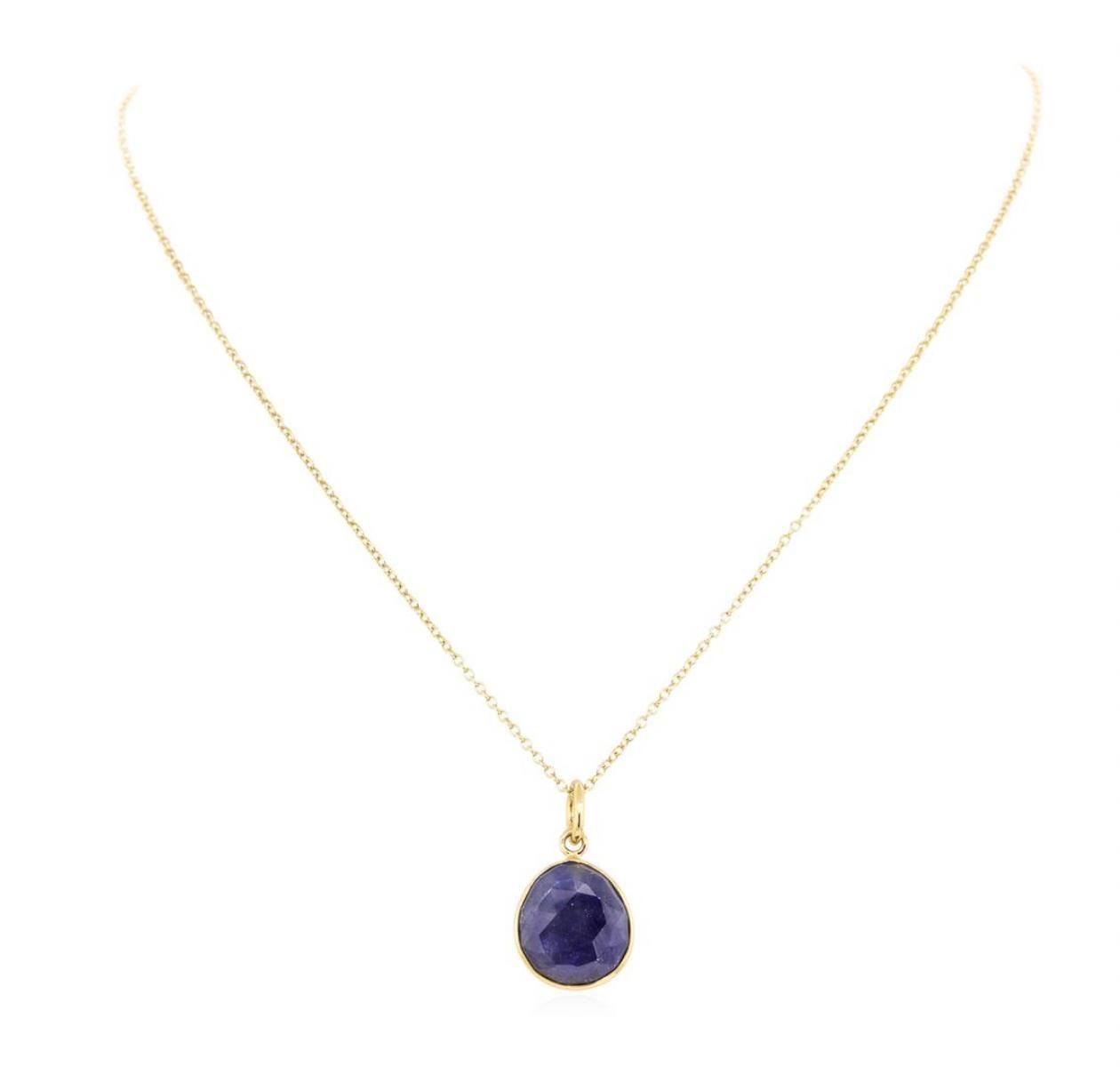 One pendant with an attached eighteen inch long cable link chain featuring: 14KT yellow gold weighing 4.8 grams containing one faceted sapphire slice.