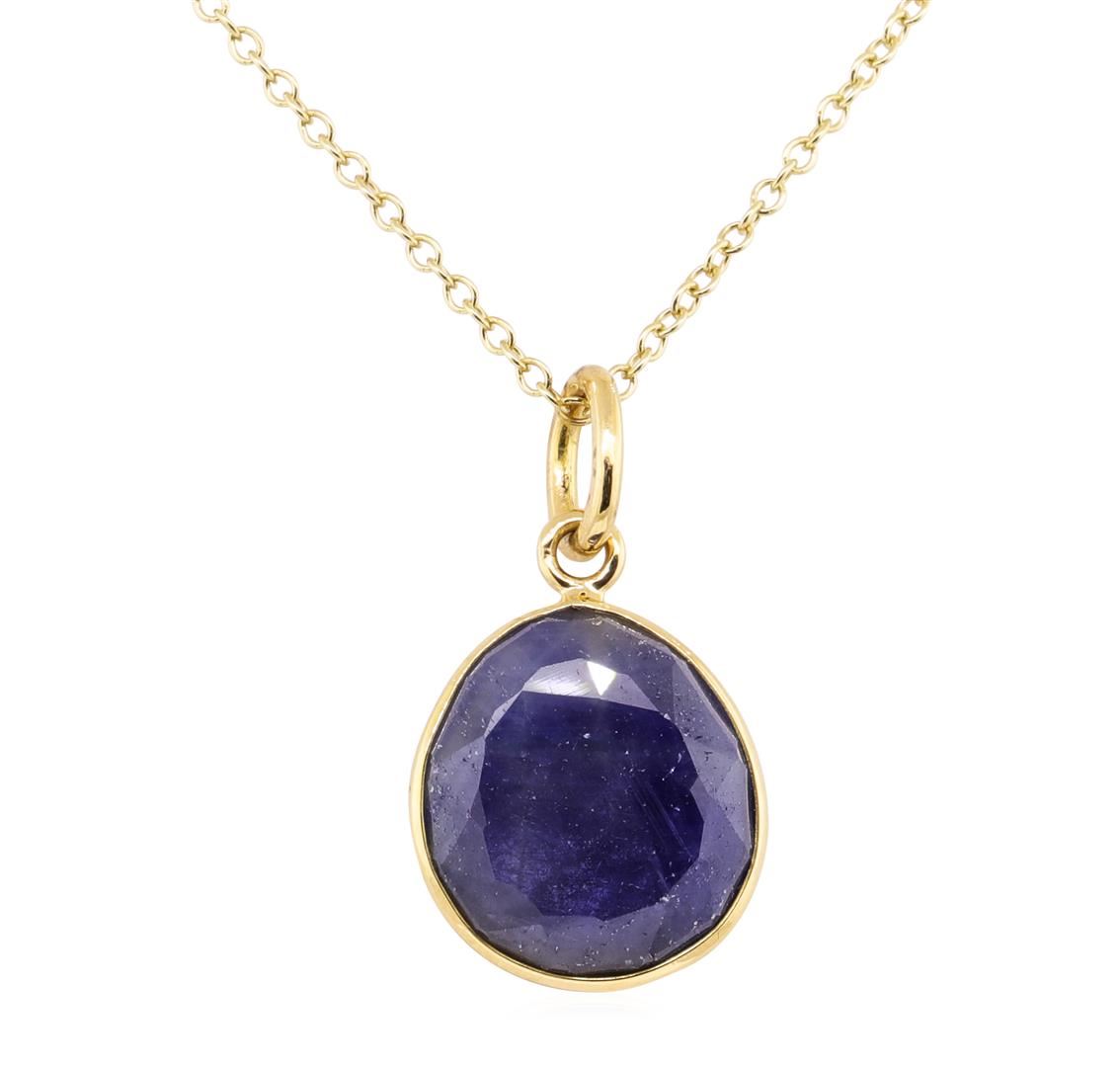 One pendant with an attached eighteen inch long cable link chain featuring: 14KT yellow gold weighing 4.8 grams containing one faceted sapphire slice.