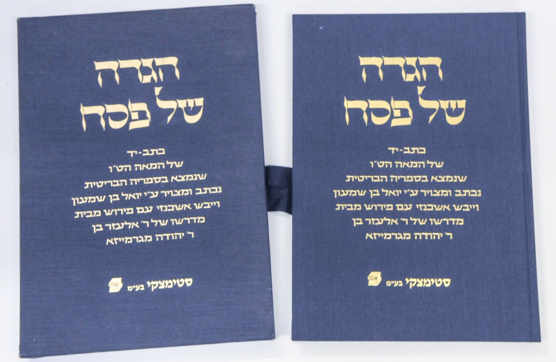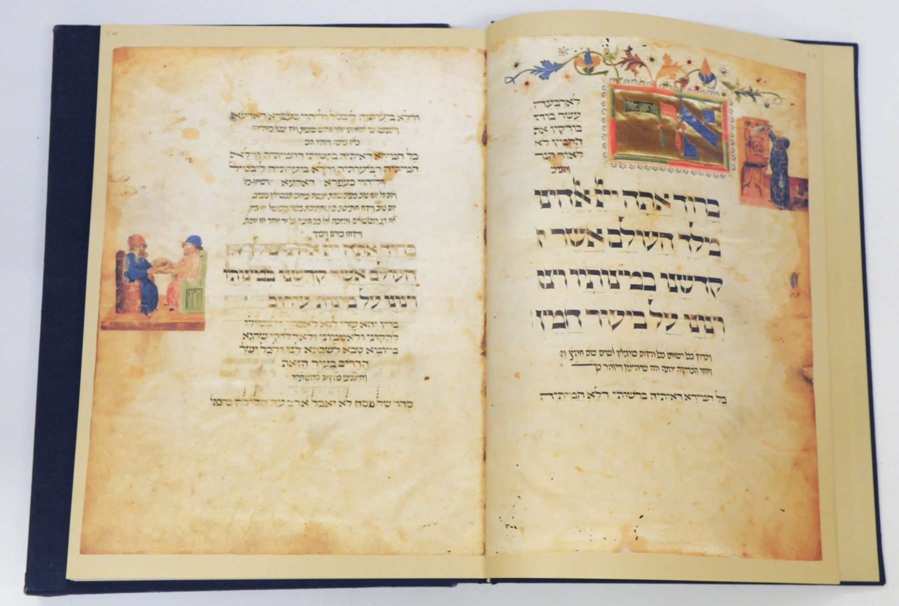 Facsimile edition of Passover Haggadah, 15th century manuscript found in the British Library. Written and illustrated by Yoel Ben Shimon and Yabesh Ashkenazi. With commentary by Rabbi Eleazar Ben Rabbi Yehuda of Worms. Includes color illustrations, introduction and English transcription by David Goldstein of the British Library in London, 1985. In good condition: upper part of the original cardboard box is corroded.