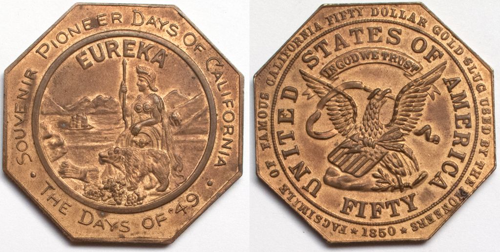 United States of America / Fifty / Facsimile of Famous California Fifty Dollar Gold Slug Used by the Pioneers / 1850 // Souvenir Pioneer Days of California / The Days of '49. Front has a picture of the American Eagle with 'In God We Trust.' Reverse has California scene, Golden Bear and the word 'Eureka.'City: County: State: CADate: