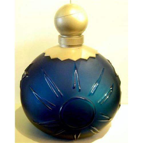 A Factice by Karl Lagerfeld & Elizabeth Arden of the Sun, Moon, & Stars. Circa. 1975. A factice is a bottle made for the purpose of display, not for sale. It is not a real bottle. This factice, was produced through the collaboration of Karl Lagerfeld and the Elizabeth Arden Company in the 1970's. Cornflower blue glass with matte silver star shaped collar and stopper. Featuring the sun on one side, a crescent moon on the other, and stars all around. Shown on page 228 of Fragrance Bottle Masterpieces by Ball and Torem. In excellent condition.