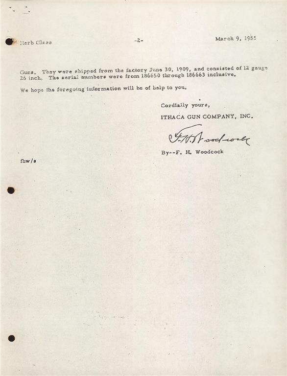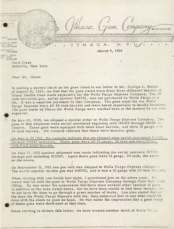 The sides of the action have the dog on point engraving with the left side marked "W.F. & CO. EX 269" and the right side marked "ITHACA GUN CO. ITHACA N.Y." The matching serial number appears on the water table, left side of the buttstock, forearm and barrels. The water table is also marked "X12." Checkered pistol grip stock with smooth forearm and factory hard rubber buttplate. Extractor, choke measures improved cylinder/loose cylinder and length of pull 14 inches. The included Ithaca factory letter confirms that this shotgun was sold to Wells Fargo and was part of a March 25, 1912 shipment to Wells Fargo that included other 12 gauge shotguns with 24 inch barrels.