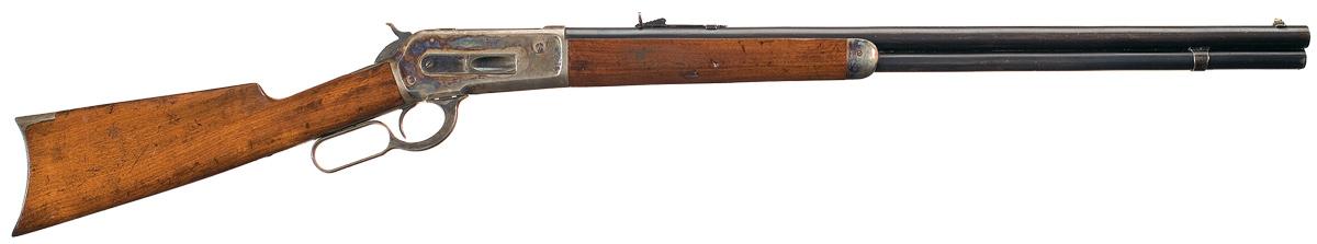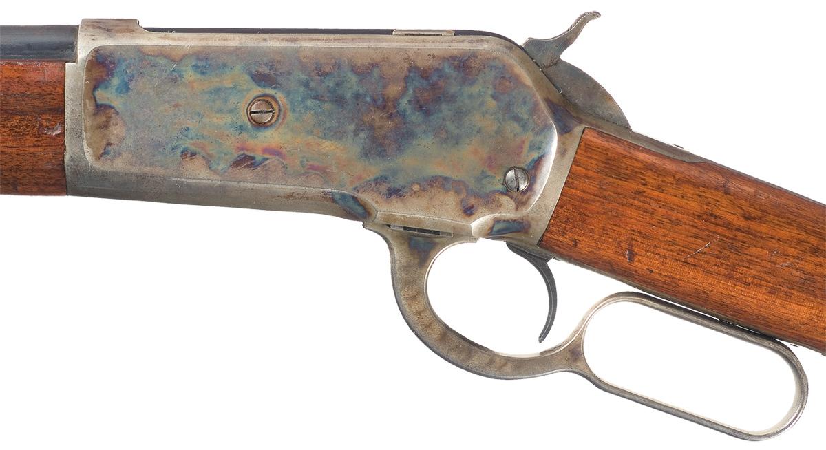 Condition: Very good. The rifle retains more than 85% of the original blue and casehardened finish. Nearly all of the original blue finish is present on the barrel, magazine and bolt with some thinning on the right side of the barrel and magazine. The forearm cap, receiver sides, hammer and loading lever retain most of the vivid case colors. The casehardened finish on the contact points on the top and bottom of the receiver, upper tang and buttplate have a dove-gray patina. The markings are crisp. The bore is bright. The stock and forearm are in very good overall condition. The forearm shows moderate handling wear and the stock has scattered light handling marks. The forearm retains about 50% of the original varnished finish and the stock approximately 85%. This is a very good example of a Winchester Model 1886 Sporting Rifle with the very desirable casehardened receiver.