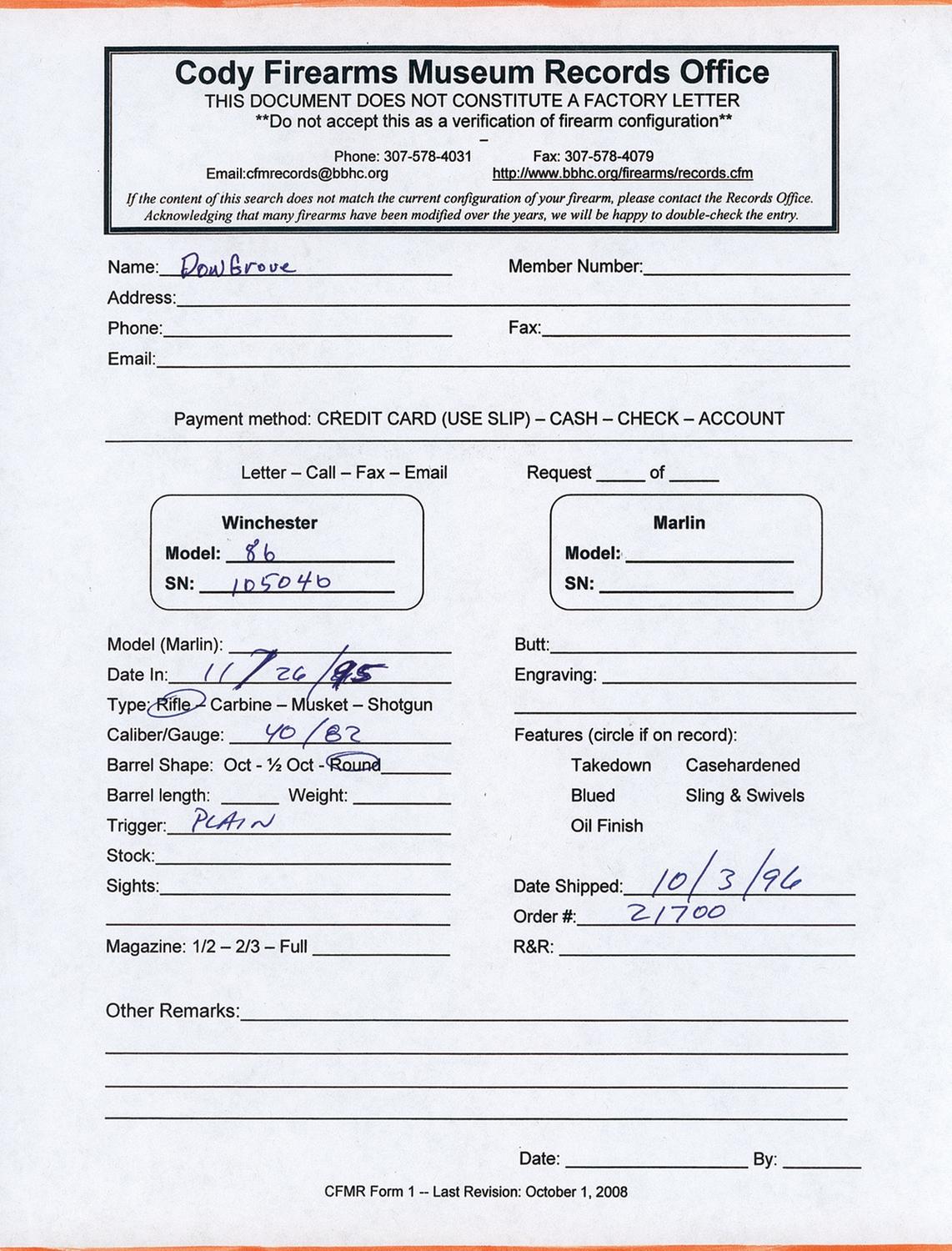 Winchester Model 1886 Sporting Rifle with casehardened receiver. The rifle is accompanied by a Cody Firearms Museum Records Office Fact Sheet. The fact sheet lists the date the rifle was received in the Winchester warehouse as November 26, 1895, and lists the configurations as "rifle, Caliber 40/82" with a round barrel and plain trigger. The rifle has a round barrel with full length magazine and has a varnished walnut stock and forearm with crescent buttplate. The barrel is fitted with a fixed nickel-silver front sight blade and sporting style rear sight. The barrel, magazine, bolt and loading gate are blued. The forearm cap, receiver, hammer, lever and buttplate have a color casehardened finish. The top of the barrel is roll-stamped "-MANUFACTURED BY THE- / - WINCHESTER REPEATING ARMS CO. NEW HAVEN CONN.U.S.A.-" in two unequal lines. The caliber designation "40-82 W.C.F." is roll-stamped on the top of the barrel ahead of the receiver. The upper receiver tang is roll-stamped "- MODEL 1886-" and the lower tang is marked with the 1884/1885 patent dates in two lines and the serial number "105040".