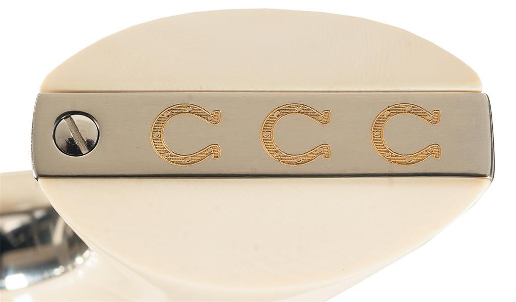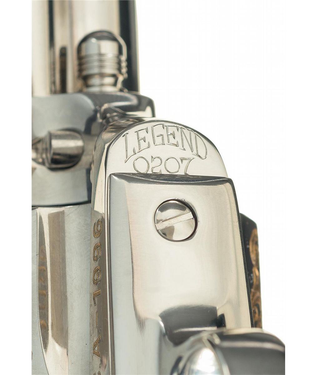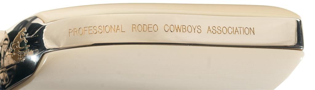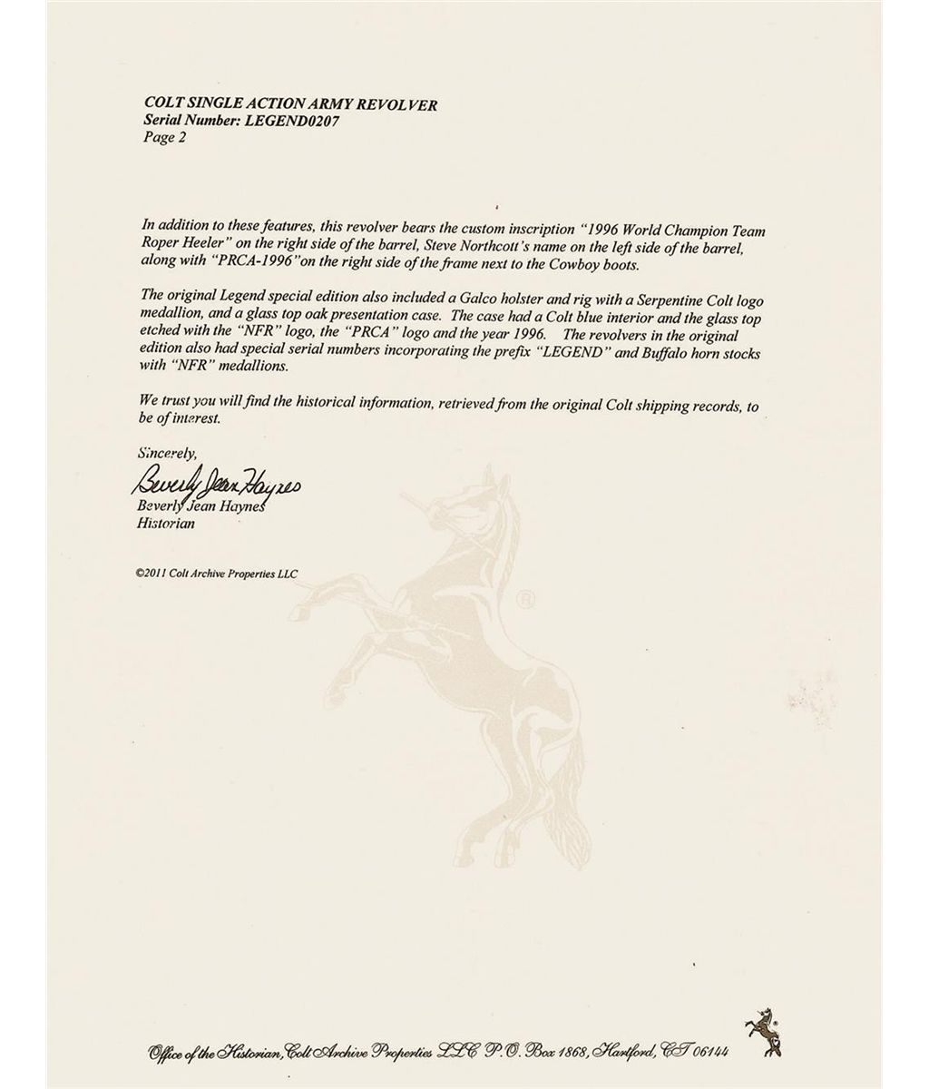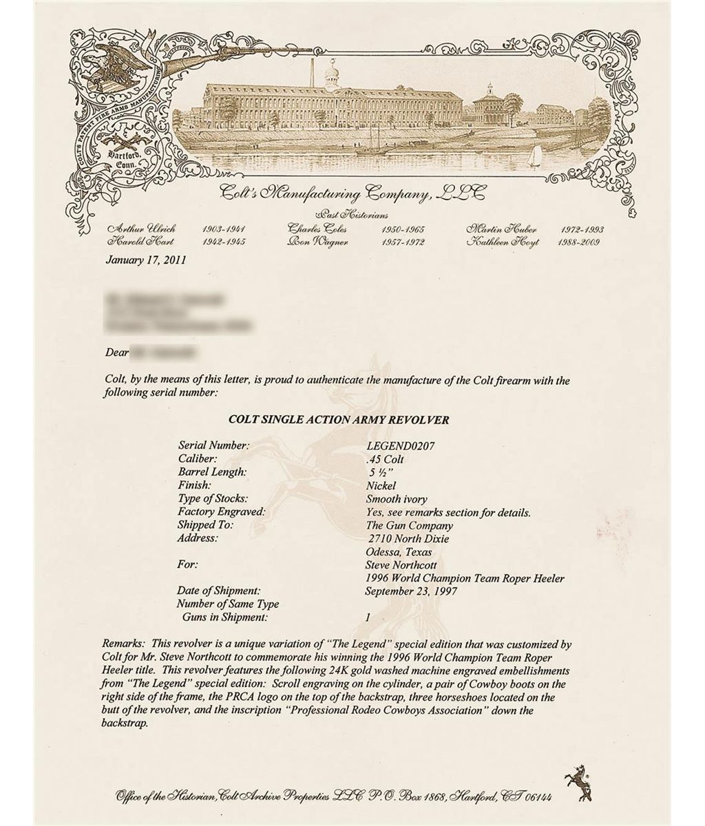 This revolver is a unique variation of "The Legend" special edition revolver for Steve Northcott to commemorate his win of the 1996 World Champion Team Roping title. He was the heeler. The left front of the barrel is engraved with his signature and the right side is engraved "1996 WORLD CHAMPION TEAM ROPING HEELER". There are gold highlighted flourishes of floral scroll on the cylinder. The right side of the frame shows a pair of cowboy boots with gold highlights and is marked "P.R.C.A.-1996" in gold. The butt has three gold horseshoes engraved on it. Fitted with ivory grips. With a Colt Custom Shop leatherette case, factory letter that confirms the configuration and that it was shipped as one to The Gun Company in Odessa, Texas on September 23rd, 1997.