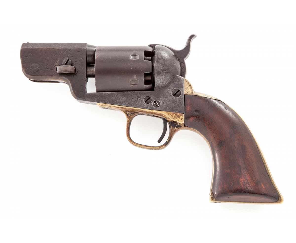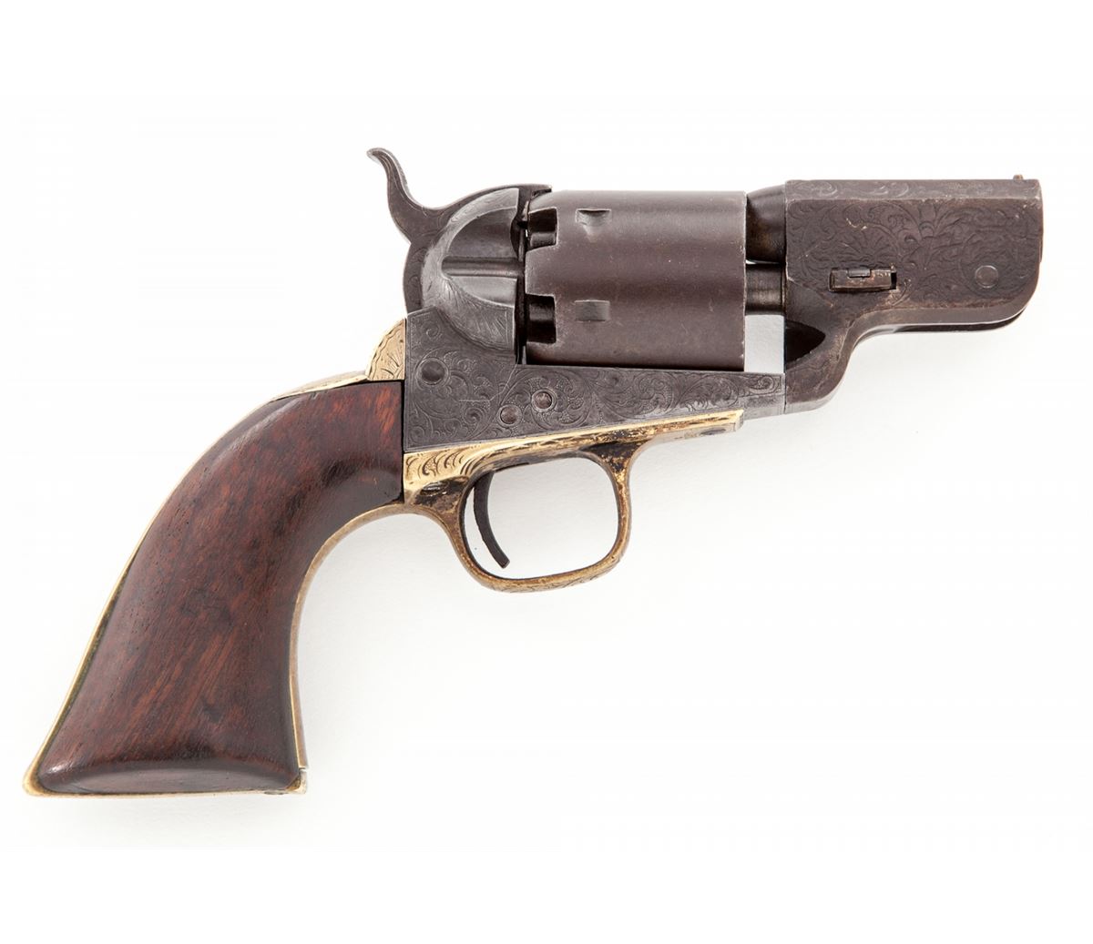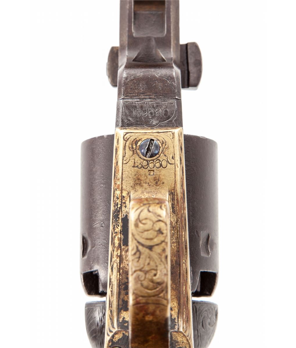 Factory Engraved Colt Model 1851 Navy Percussion Revolver, #139660(E), .36 cal., barrel shortened to 2-3/8'' with brass bead added, engraved frame, brass backstrap and triggerguard, with one-piece walnut grips. Sometimes known as the ''Mormon Avenger''. Condition is very good as modified with moderate overall patination to brown. Crisp period floral scrolls are in the Gustave Young fashion. Wolf's head hammer is clearly visible; cylinder is smooth and little of the naval engagement scene remains. Grips show fractional shrinkage and small loss at left toe. Action is crisp, bore is dark, all visible matching numbers including wedge (except backstrap). Est.: $1,800-$2,400. (Antique)