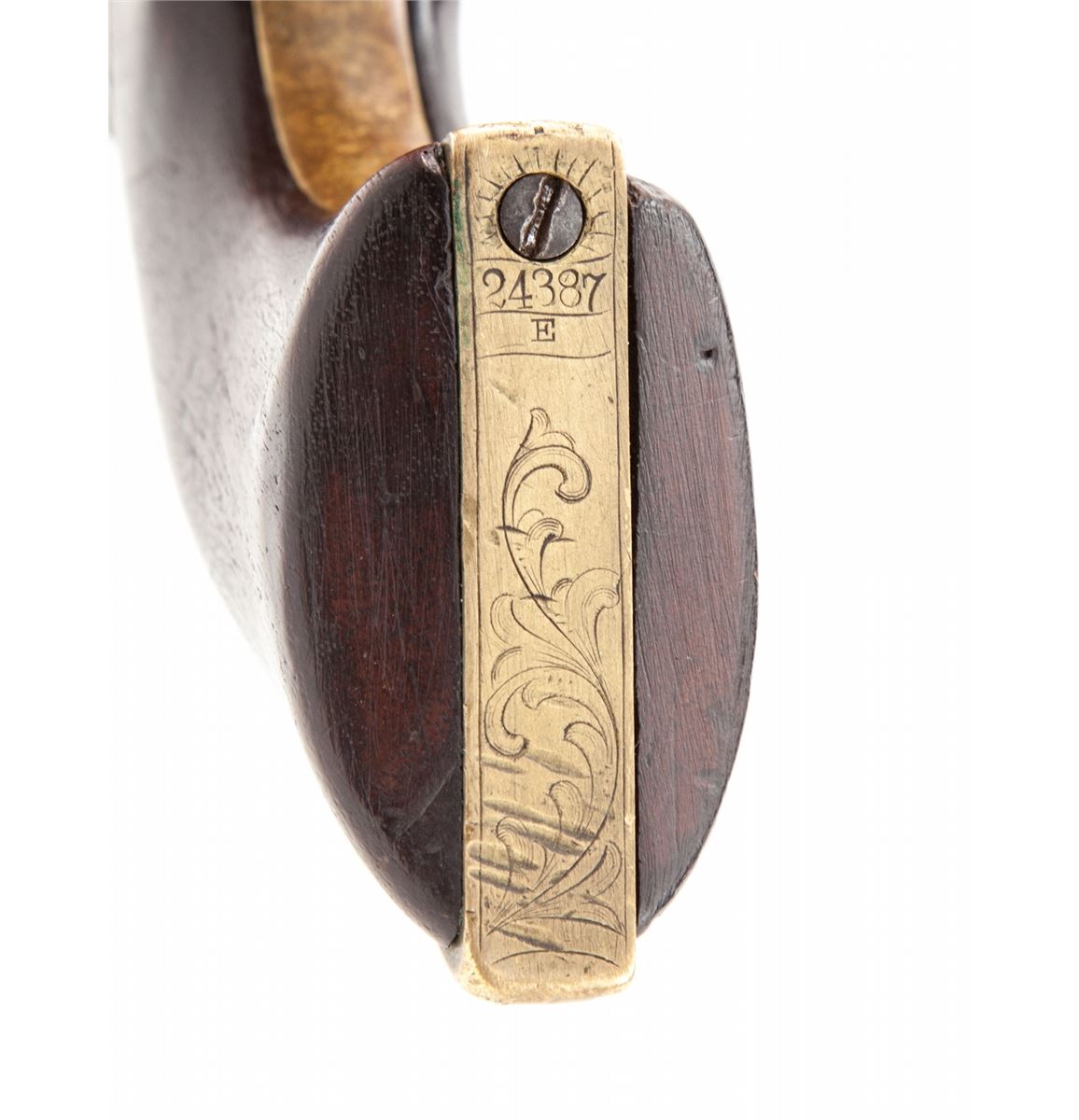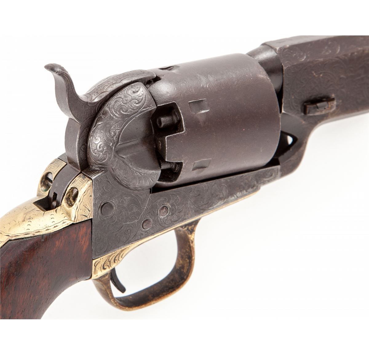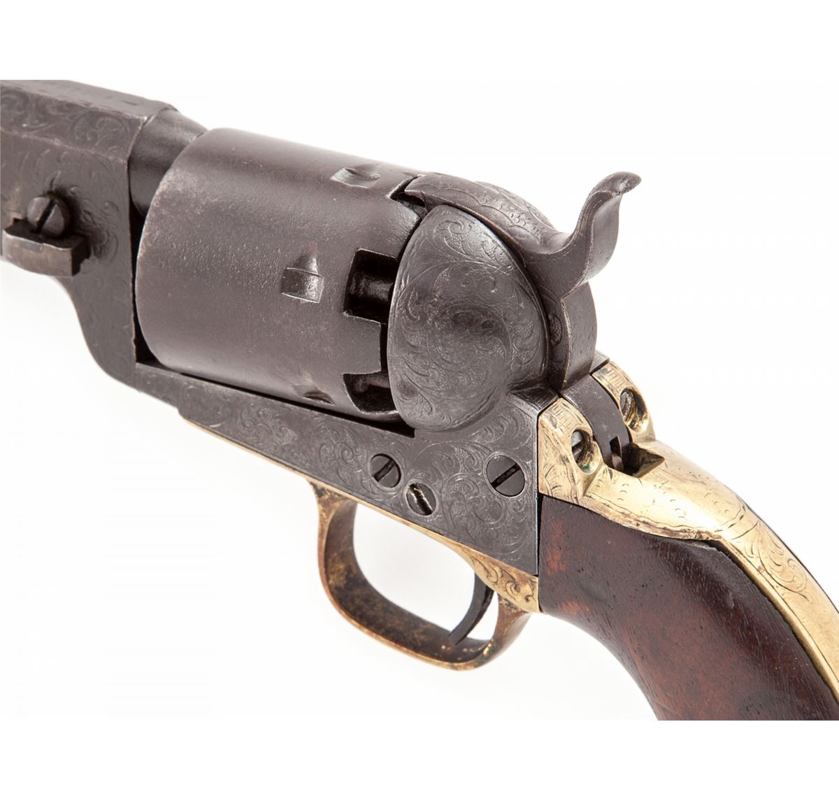 Factory Engraved Colt Model 1851 Navy Percussion Revolver, #139660(E), .36 cal., barrel shortened to 2-3/8'' with brass bead added, engraved frame, brass backstrap and triggerguard, with one-piece walnut grips. Sometimes known as the ''Mormon Avenger''. Condition is very good as modified with moderate overall patination to brown. Crisp period floral scrolls are in the Gustave Young fashion. Wolf's head hammer is clearly visible; cylinder is smooth and little of the naval engagement scene remains. Grips show fractional shrinkage and small loss at left toe. Action is crisp, bore is dark, all visible matching numbers including wedge (except backstrap). Est.: $1,800-$2,400. (Antique)