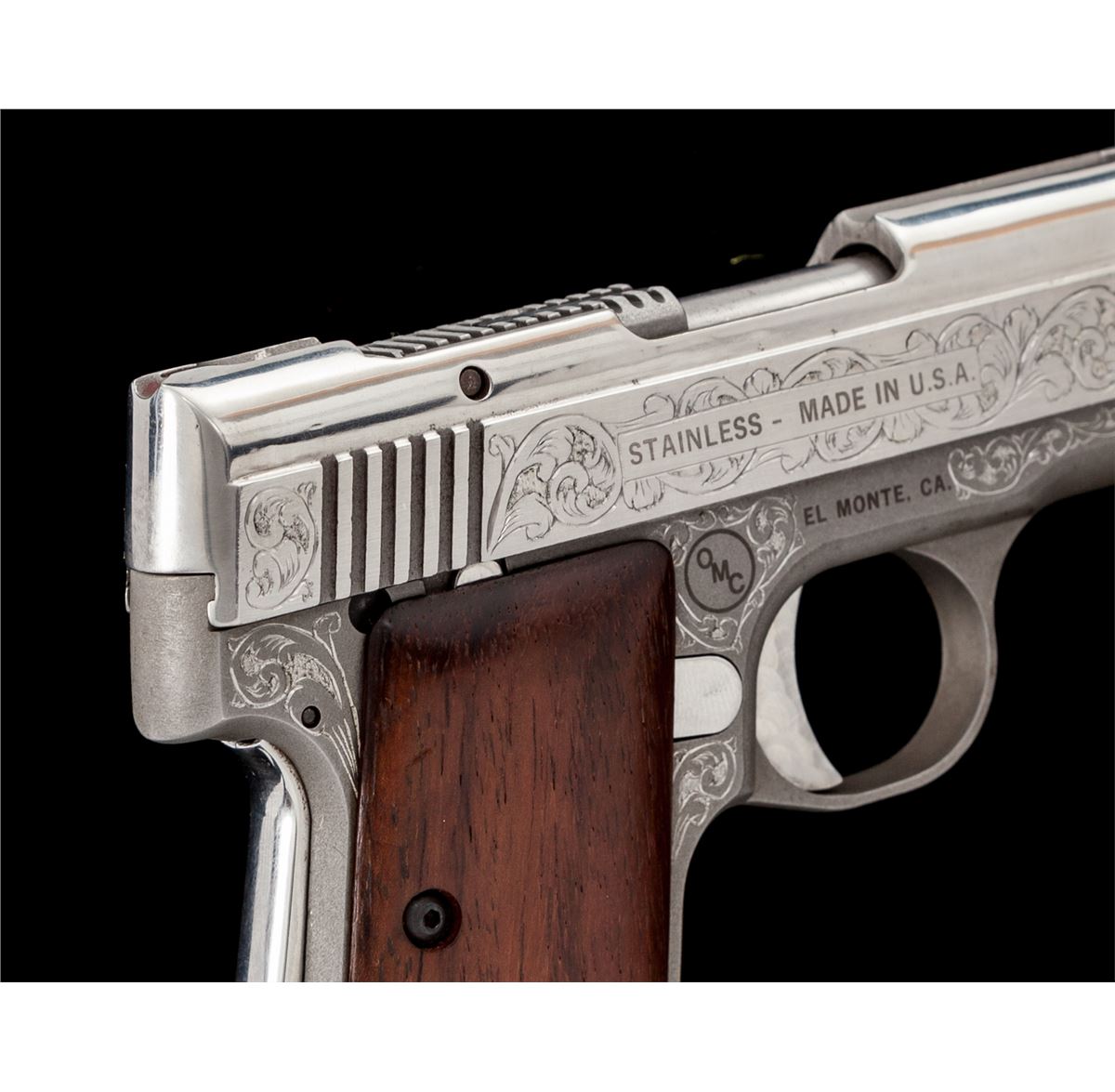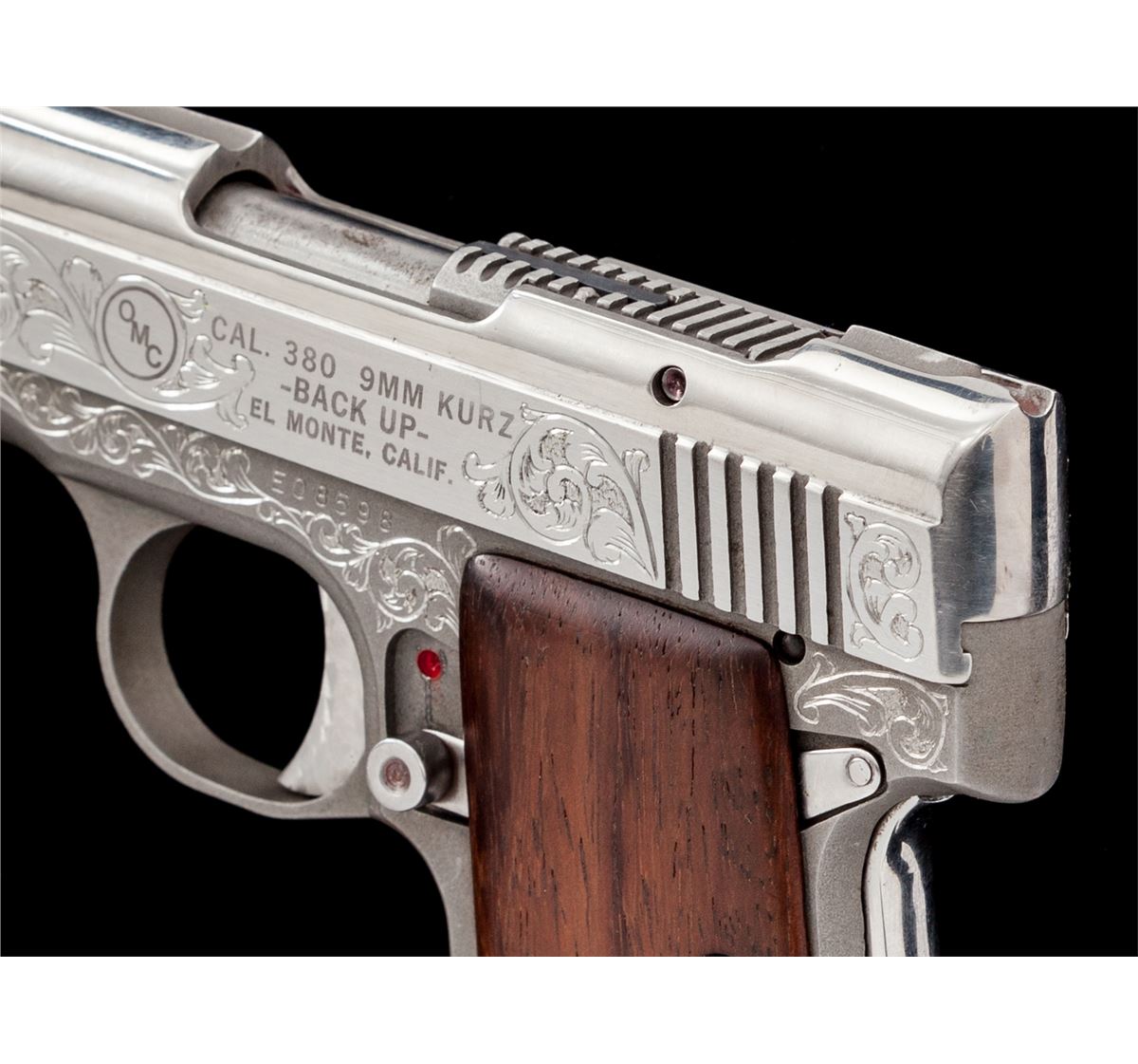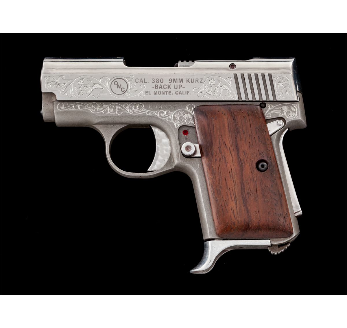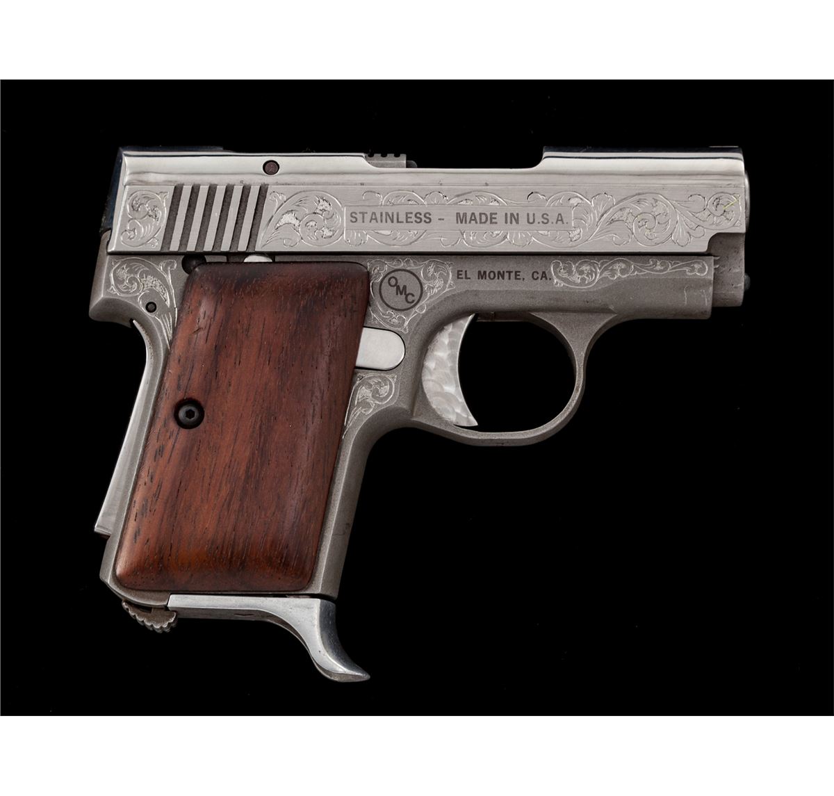 Factory Engraved OMC Back-Up Semi-Automatic Pistol, #EO8598, .380 cal., 2-1/2'' barrel, scroll engraved stainless steel finish, smooth walnut grip panels, and one magazine. Condition is excellent showing little use, in its original box. Est.: $350-$500. (Modern/PPT)