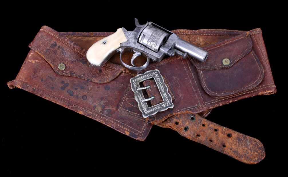 Factory engraved and ivory stocked, superb condition “BRITISH BULLDOG” marked revolver, with superb wide belt and holster dating from approximately 1880-1895! This revolver is chambered for the unusual .44 Bulldog Short center fire cartridge with 5-shot un-fluted cylinder and 2 1/2” round with flat top barrel. Many, if not most, Bulldog revolvers were made in smaller calibers, making this big .44 caliber scarce and desirable. This beautiful revolver retains a lovely nickel and patina finish and displays original engraving on the cylinder, frame and back strap. It is a double action revolver in which a single pull of the trigger cocks the hammer and fires the cartridge. It can also be shot single action by pulling the hammer back manually before pulling the trigger. The top strap over the cylinder is marked “BRITISH” and “BULL DOG.” There are no visible foreign proof marks on this revolver which would indicate U.S. manufacture. This is a much better example than normally encountered on the collector market. The ivory grips are sound and show a lovely mellow aged patina. The loading gate is spring activated and fully operational, snapping into place after being opened. Recent books devoted to the Bulldog revolvers shed light on the fact that they were some of the most common and popular firearms in the nineteenth century Frontier West as well as with inhabitants of the “more civilized East.” It is interesting to note that on July 2, 1881, President James Garfield was shot twice while traveling through a Washington railroad depot. His assassin, Charles Guiteau, used a Bulldog revolver very much like this one. Bulldog revolvers this embellished and in this outstanding state of preservation, inside and out, are rarely offered on the collector market today. Additionally, paired with this embellished revolver is the original money belt with sewn-in holster and pockets. The belt measures a full 4” wide. It is approx. 38” long overall with a thick and heavy double-prong silver buckle at one end. On the left side is a small snap-fastened covered pouch that measures 3 1/2” wide and 3” deep, next to this pouch is a cross-draw holster. Next to the holster are two identical, large snap fastened pouches or pockets that measure 7 ¼” wide by 3 ¼” deep. It is interesting to note that snap fasteners were invented by a German inventor named Heribert Bauer in 1885. All seams, stitching, snaps and leather are intact and in a remarkable state of preservation. This beautiful condition and unusual holster rig combined with the original Western Bulldog .44 center fire caliber ivory gripped revolver make for a stunning display of an extremely rare set. This firearm qualifies as an Antique, and does not require FFL Transfer or NICS Background Check.