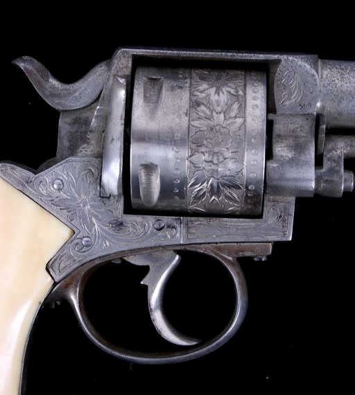 Factory engraved and ivory stocked, superb condition “BRITISH BULLDOG” marked revolver, with superb wide belt and holster dating from approximately 1880-1895! This revolver is chambered for the unusual .44 Bulldog Short center fire cartridge with 5-shot un-fluted cylinder and 2 1/2” round with flat top barrel. Many, if not most, Bulldog revolvers were made in smaller calibers, making this big .44 caliber scarce and desirable. This beautiful revolver retains a lovely nickel and patina finish and displays original engraving on the cylinder, frame and back strap. It is a double action revolver in which a single pull of the trigger cocks the hammer and fires the cartridge. It can also be shot single action by pulling the hammer back manually before pulling the trigger. The top strap over the cylinder is marked “BRITISH” and “BULL DOG.” There are no visible foreign proof marks on this revolver which would indicate U.S. manufacture. This is a much better example than normally encountered on the collector market. The ivory grips are sound and show a lovely mellow aged patina. The loading gate is spring activated and fully operational, snapping into place after being opened. Recent books devoted to the Bulldog revolvers shed light on the fact that they were some of the most common and popular firearms in the nineteenth century Frontier West as well as with inhabitants of the “more civilized East.” It is interesting to note that on July 2, 1881, President James Garfield was shot twice while traveling through a Washington railroad depot. His assassin, Charles Guiteau, used a Bulldog revolver very much like this one. Bulldog revolvers this embellished and in this outstanding state of preservation, inside and out, are rarely offered on the collector market today. Additionally, paired with this embellished revolver is the original money belt with sewn-in holster and pockets. The belt measures a full 4” wide. It is approx. 38” long overall with a thick and heavy double-prong silver buckle at one end. On the left side is a small snap-fastened covered pouch that measures 3 1/2” wide and 3” deep, next to this pouch is a cross-draw holster. Next to the holster are two identical, large snap fastened pouches or pockets that measure 7 ¼” wide by 3 ¼” deep. It is interesting to note that snap fasteners were invented by a German inventor named Heribert Bauer in 1885. All seams, stitching, snaps and leather are intact and in a remarkable state of preservation. This beautiful condition and unusual holster rig combined with the original Western Bulldog .44 center fire caliber ivory gripped revolver make for a stunning display of an extremely rare set. This firearm qualifies as an Antique, and does not require FFL Transfer or NICS Background Check.