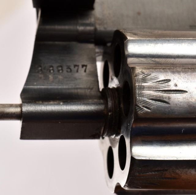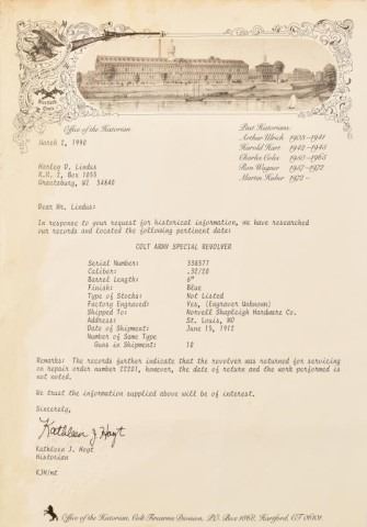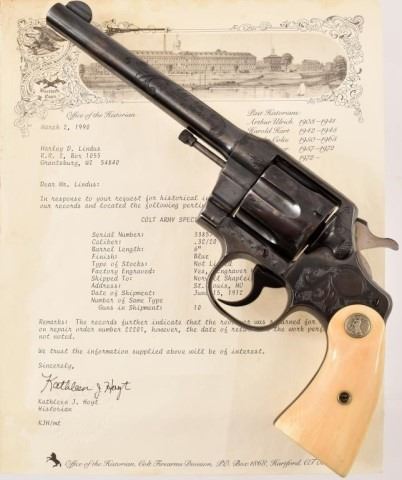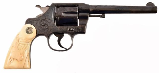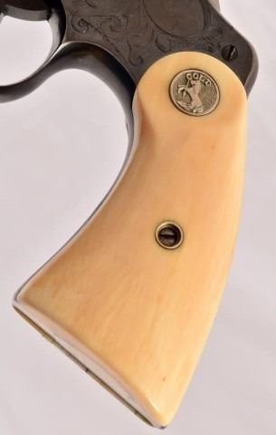 * Factory letter, 6" barrel, carved ivory grips. 90% plus condition. SN 338577 (1912)