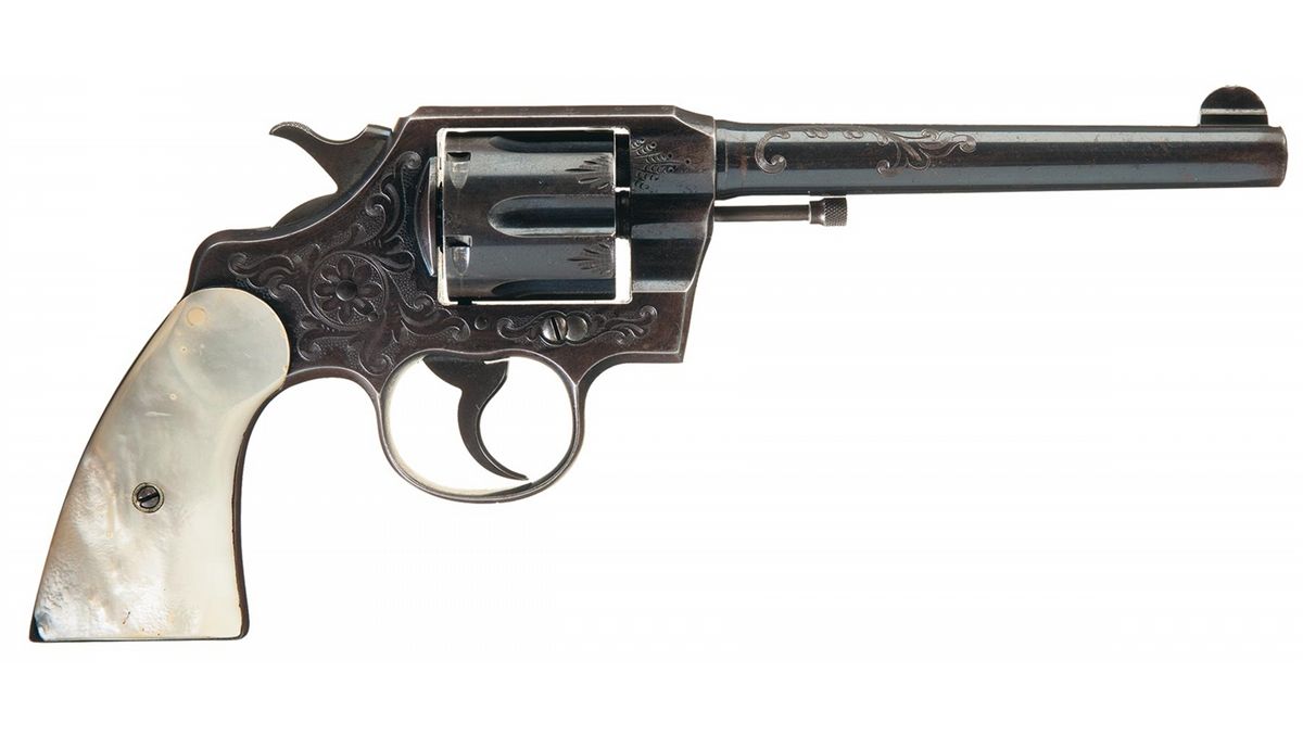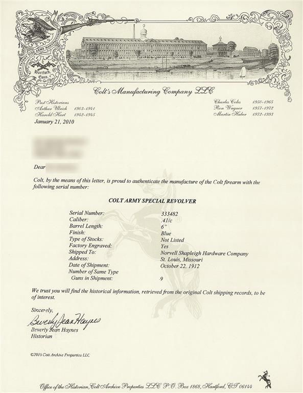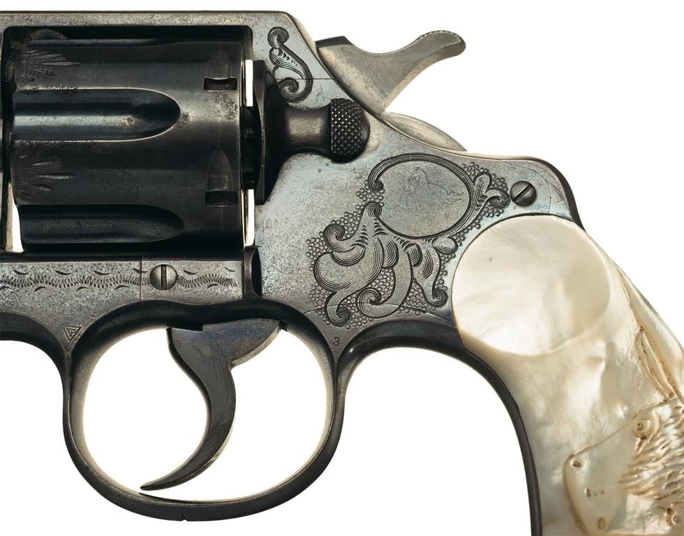 Manufactured in 1912, this revolver features factory scroll engraving on the rear barrel sides and scroll and punch dot on the frame sides. The front of the cylinder flats have a simple leaf design and there is a floral design in the center of the scroll engraving on the right rear of the frame. The top of the barrel is marked with the two line address/patent dates and the left side is marked "COLT ARMY/SPECIAL 41". Blade front and frame notch rear sights and fitted with pearl grips with a steer head carved on the left panel. The accompanying factory letter verifies the serial number, 41/c caliber, 6" barrel, blue finish, factory engraving with grips as "Not Listed" and that it was shipped to Norvell Shapleigh Hardware Company, St. Louis, Missouri on October 22, 1912.