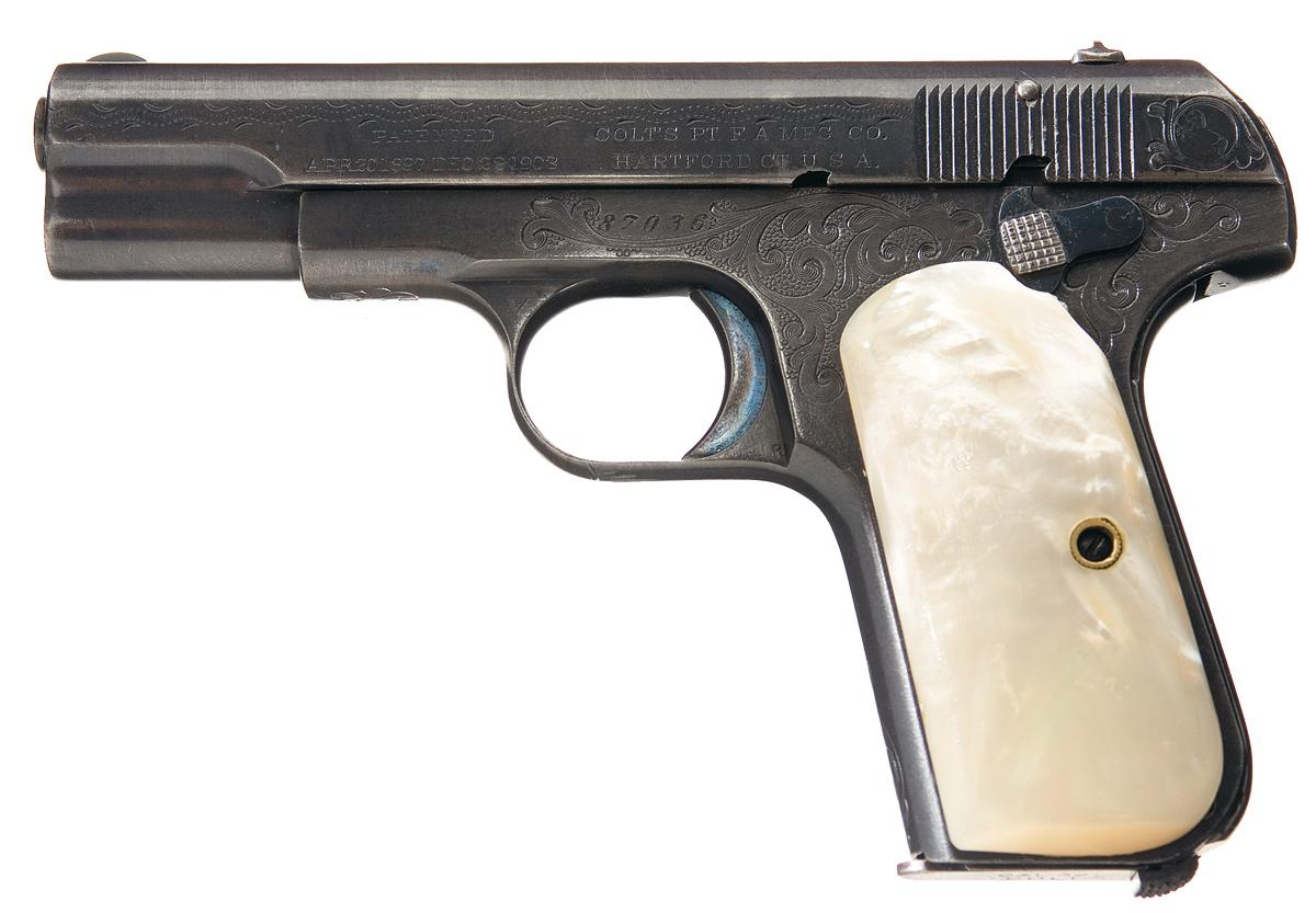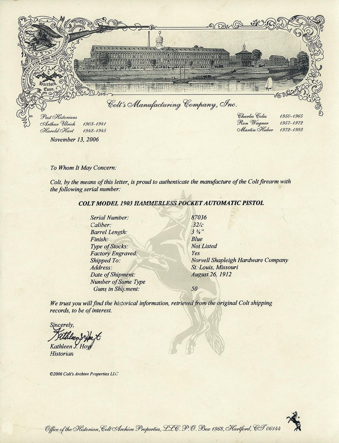 Manufactured in 1912 this pistol features factory scroll engraving with a punch dot background on the sides of the frame, and on the top of the slide. Then front of the rear sight and bottom of the front strap have a zigzag design. There is a circle of scroll engraving around the Rampant Colt. The left side of the slide has the two-line, two block address and patent dates (1897 & 1903 ) with the Rampant Colt behind the serrations. The right side of the slide is marked, "AUTOMATIC COLT / CALIBRE 32 RIMLESS SMOKELESS" below the ejection port. The Colt triangle "VP" proof is marked on the upper left front of the trigger guard. Blue barrel with bright chamber, two tone Colt marked magazine and fitted with two piece pearl grips. The accompanying factory letter verifies the serial number, caliber, barrel length, blue finish, factory engraving with the grips "Not Listed" and that it was shipped as 1 of 50 to Norvell Shapleigh Hardware Company, St. Louis, Missouri on August 26, 1912.