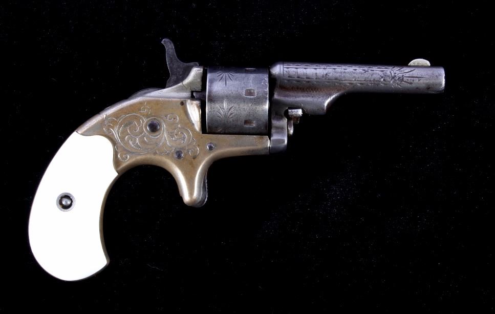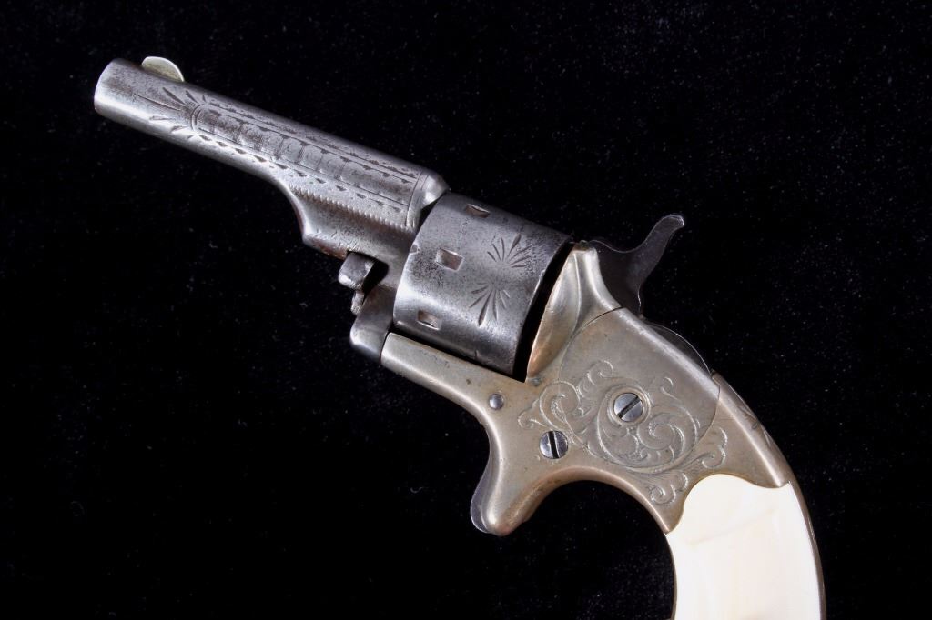 This lot features a Superb Factory Engraved and Ivory Gripped Colt Open Top .22 Caliber Revolver. The Colt Open Top Pocket Model Revolver was a single action pocket revolver introduced by the Colt's Patent Fire Arms Manufacturing Company in 1871. Introduced a year before the Colt Open Top (a model from 1872) and two years before the Colt Peacemaker and the Colt New Line(both introduced in 1873), the Colt Open Top Pocket Model Revolver was, alongside the Colt House Revolver, one of the two first metallic cartridge rear-loading revolvers manufactured by Colt's. It also was one of the first pocket metallic cartridge revolvers made by the company. Several similarly engraved Open Top Colts are depicted on pages 270-272 in the classic reference book COLT ENGRAVING by R. L. Wilson and are attributed to Colt’s main engraver from 1871-1921,Cuno A. Helfricht. This engraved pocket revolver is more ornate than many in that it has engraving on the frame, back strap, cylinder and both barrel sides. It also has factory ivory grips that are in superb condition with no chips, cracks or splits. Matching serial numbers on the frame and 2 3/8” barrel, markings include “22 CAL” on the left side of the frame and the correct two line Colt name and address on the barrel top, all engraving remains distinct and clear. Fine mechanics and screws with original front sight intact. This revolver was manufactured in 1874. Antique firearm. NO FFL transfer or NICS background check required. The serial number is 25566.