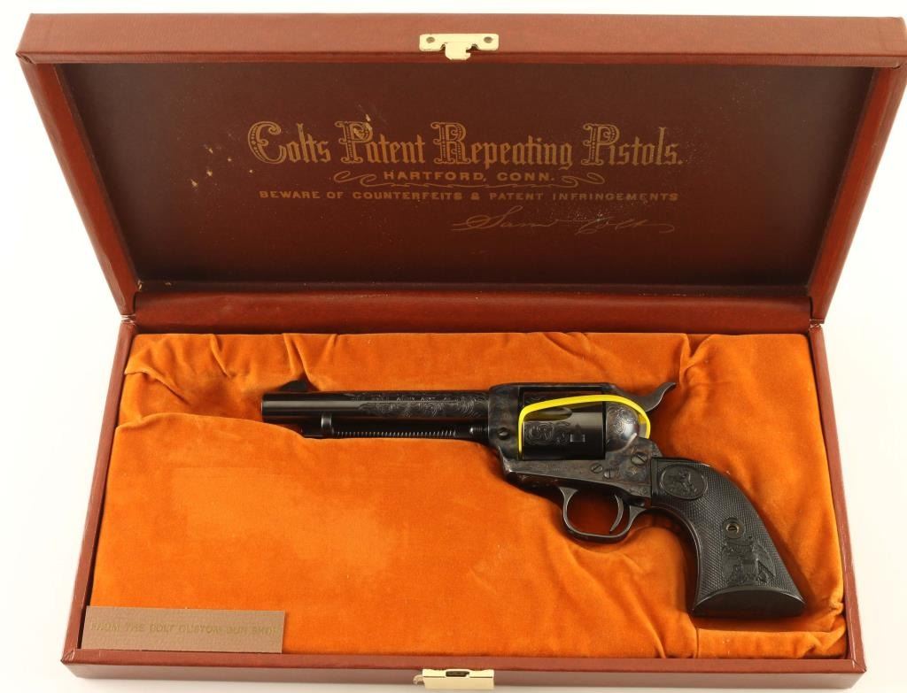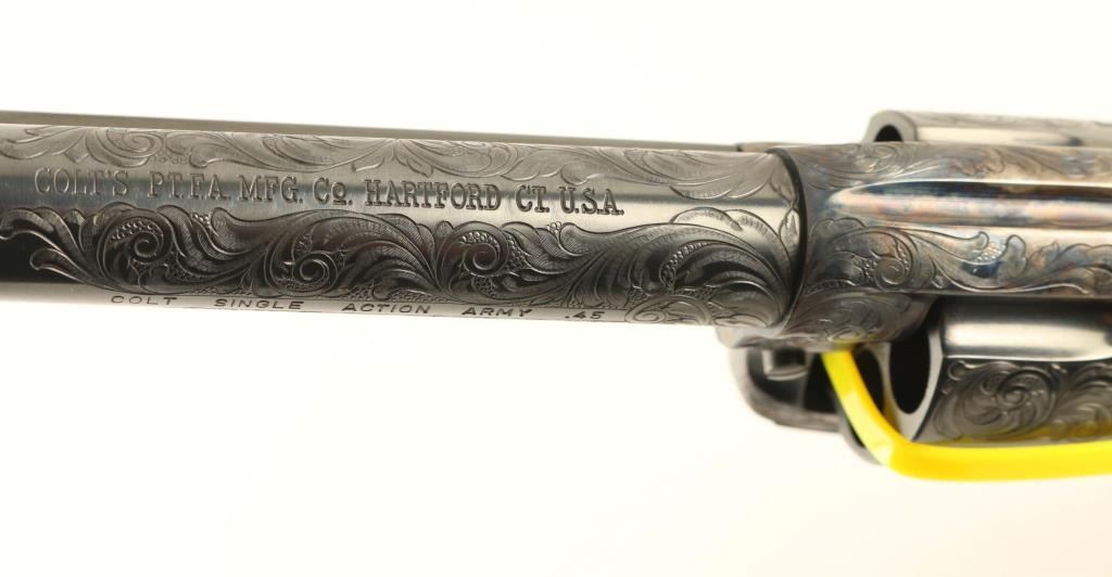 .45 LC SN: SA24784 Gorgeous, factory ‘C’ coverage engraved, third generation single action revolver manufactured circa 1979. Features beautiful 75% coverage floral scroll engraving, blued & case hardened finish, 5 1/2” barrel with single line address, blade front sight, square notched rear sight, fluted six-shot cylinder, ejector rod, smooth thin trigger, hammer with polished flats & knurled spur, and factory two-piece federal eagle checkered black synthetic grips with molded Rampant Colt décor. Matching serial numbers are observed on the frame, backstrap (found under the left grip), frontstrap (found under the left grip), cylinder and both grips. The front strap is also marked “COLT ENG”. Includes a French fitted presentation case from the Colt Custom Shop with documents and card that reads “FROM THE COLT CUSTOM GUN SHOP”. Revolver retains nearly all of its original finish with a spot spot of dark oxidation on the left side of the hammer and no observed wear. Action is untested, the bore is pristine and the synthetic grips are extra fine. Condition is like NRA Perfect in case. ***Modern Firearms***