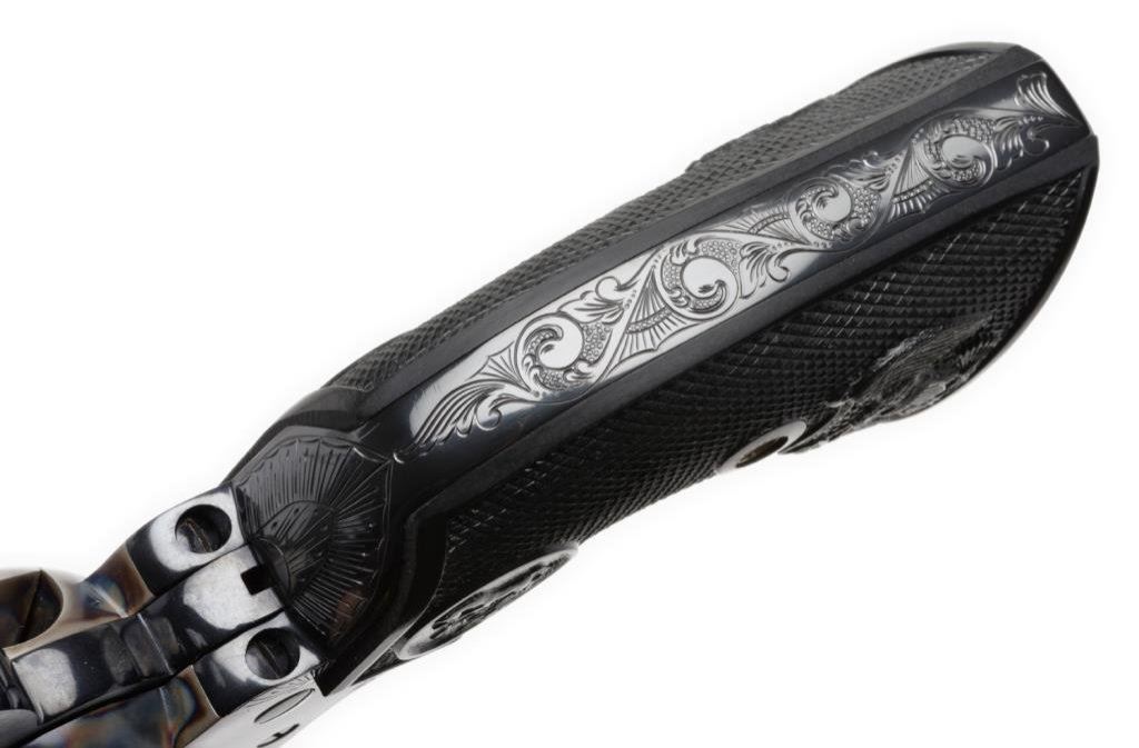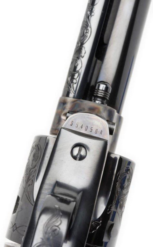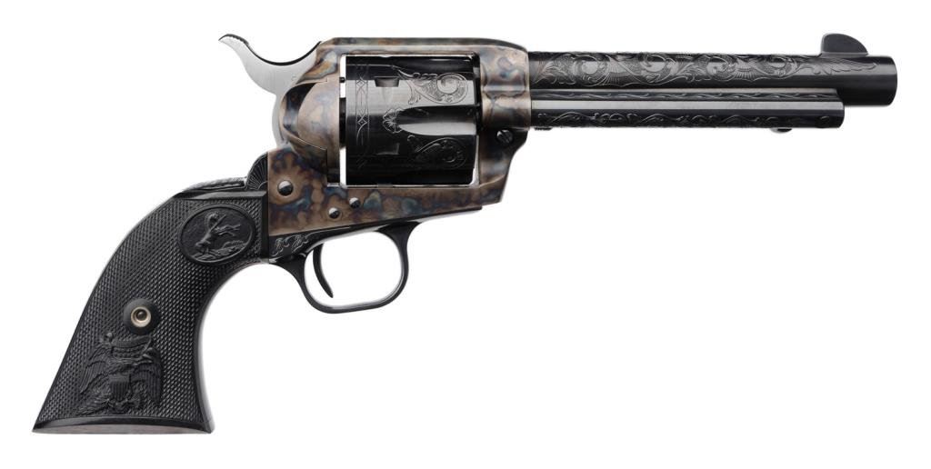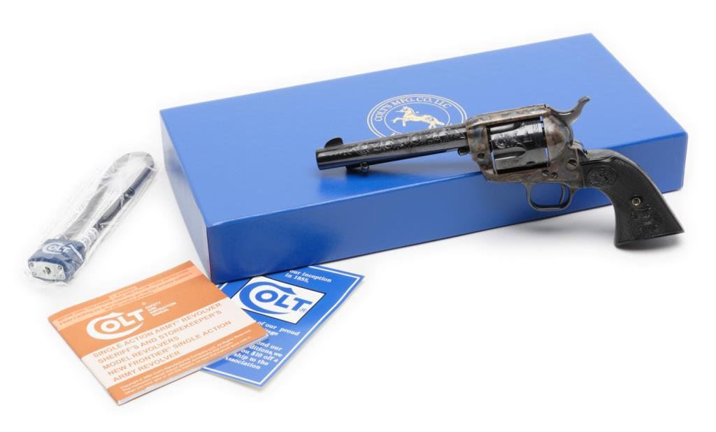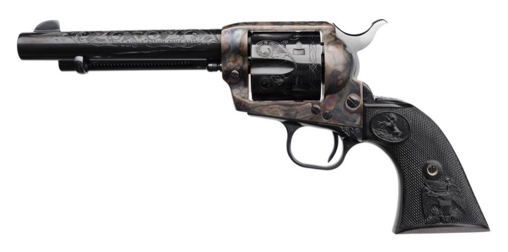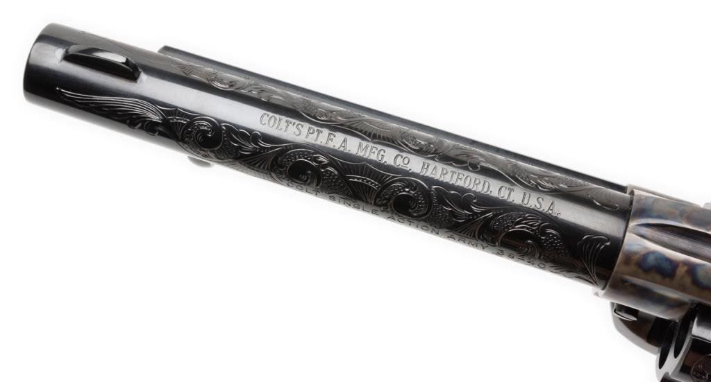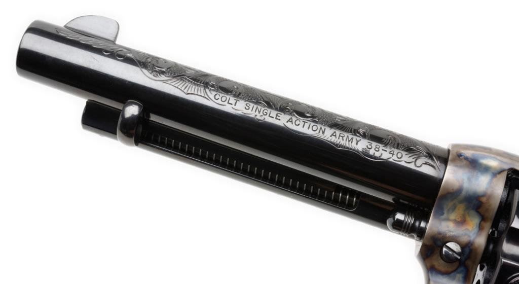 **Factory Engraved Colt Third Generation SAA revolver in scarce .38-40 caliber, 5.5” barrel, S/N S54056A, blued and case hardened finish, checkered black hard rubber eagle grips; accompanied in a factory two piece blue cardboard box with padding, gun lock and instructions; also white outer cardboard sleeve. This Colt is in like new condition displaying little handling; beautiful vivid case colors on the frame and bright blue to balance of gun. Accompanied by 2 color photos and Certificate by Downing. Est.: $1,500-$3,000.