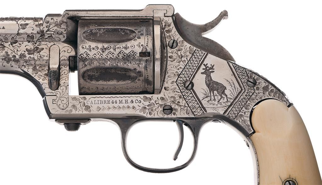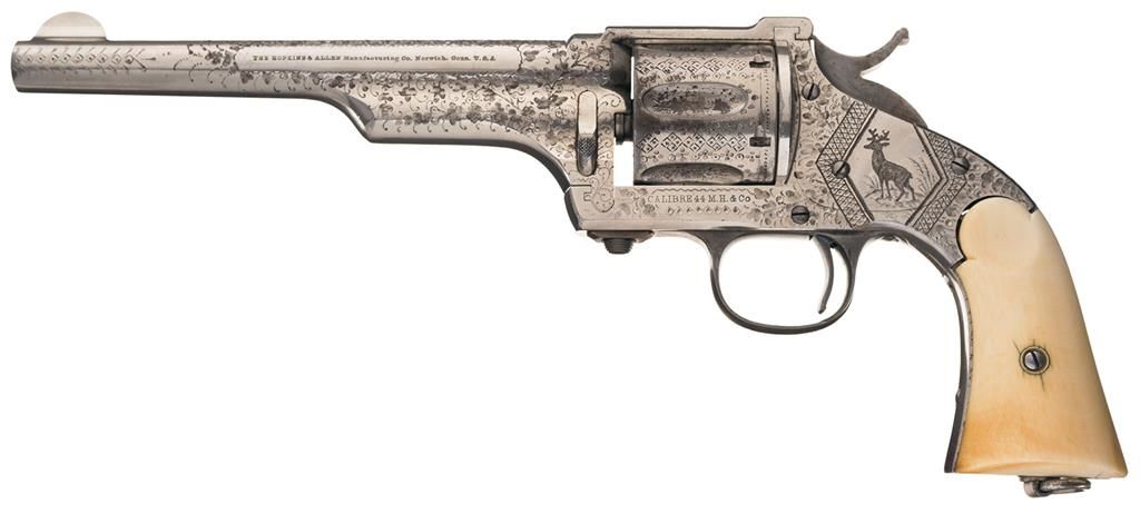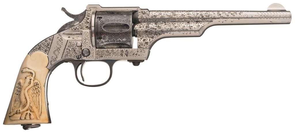 This is an exceptional example of a factory engraved Merwin Hulbert large frame, single action revolver that was manufactured circa 1876-1880. This example is a Third Model revolver and has a square butt, top strap and scooped cylinder flutes. The revolver is fully engraved with the distinctive Merwin Hulbert engraving which consists of intricate punch dot floral motifs and a stag engraved in a panel on the left side of the frame. The revolver butt is fitted with a lanyard loop. The top of the barrel is marked with the one line Merwin Hulbert legend with 1874-1877 patent dates. The left side of the barrel is engraved "THE HOPKINS & ALLEN Manufacturing Co. Norwich. Conn. U.S.A." in a panel with scalloped borders. "CALIBRE 44 M.H. & Co." is marked on the left side of the frame below the cylinder. "17968" is stamped on the bottom of the butt. The rear face of the barrel and the cylinder are numbered "8211". This deluxe model revolver has a nickel-plated finish with casehardened hammer and trigger guard. The revolver has two-piece ivory grips with the right grip relief carved with the Mexican eagle and serpent motif.