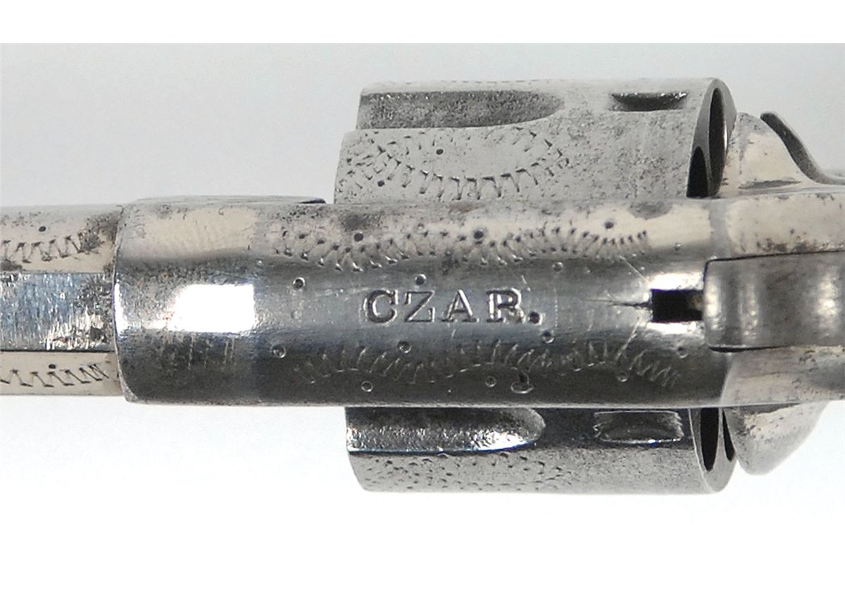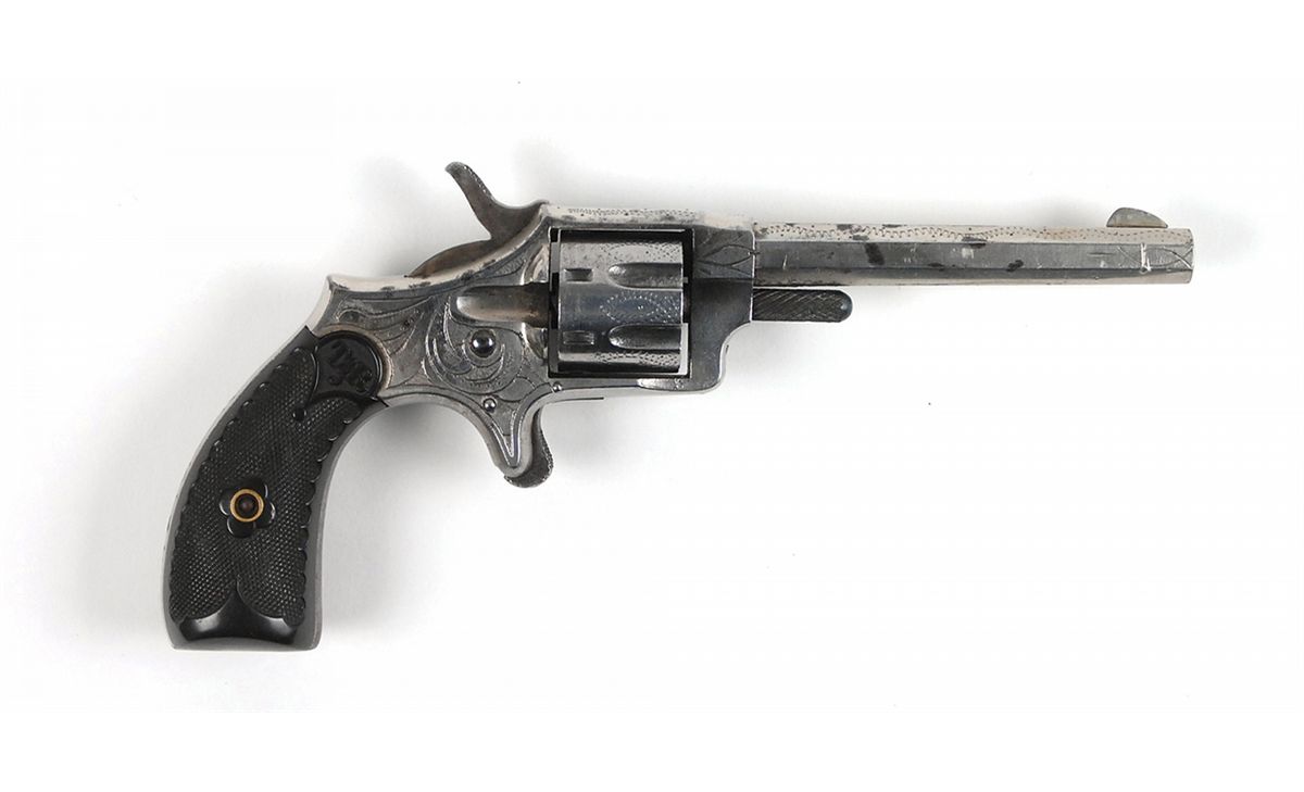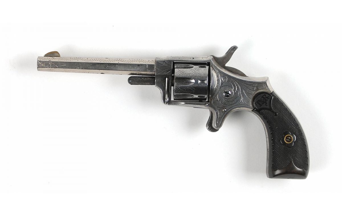 #2549, cal. .22 rimfire, 3 7/16? octagonal barrel, the bore has light corrosion. This single-action spur trigger revolver retains over 80% factory nickel plating with all of the lettering in excellent condition and most of the engraving in fine condition. The checkered hard rubber grips are in fine condition and have the molded initials “T & R” at the top. The mechanism works well.