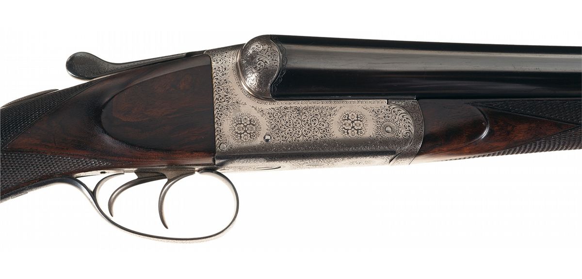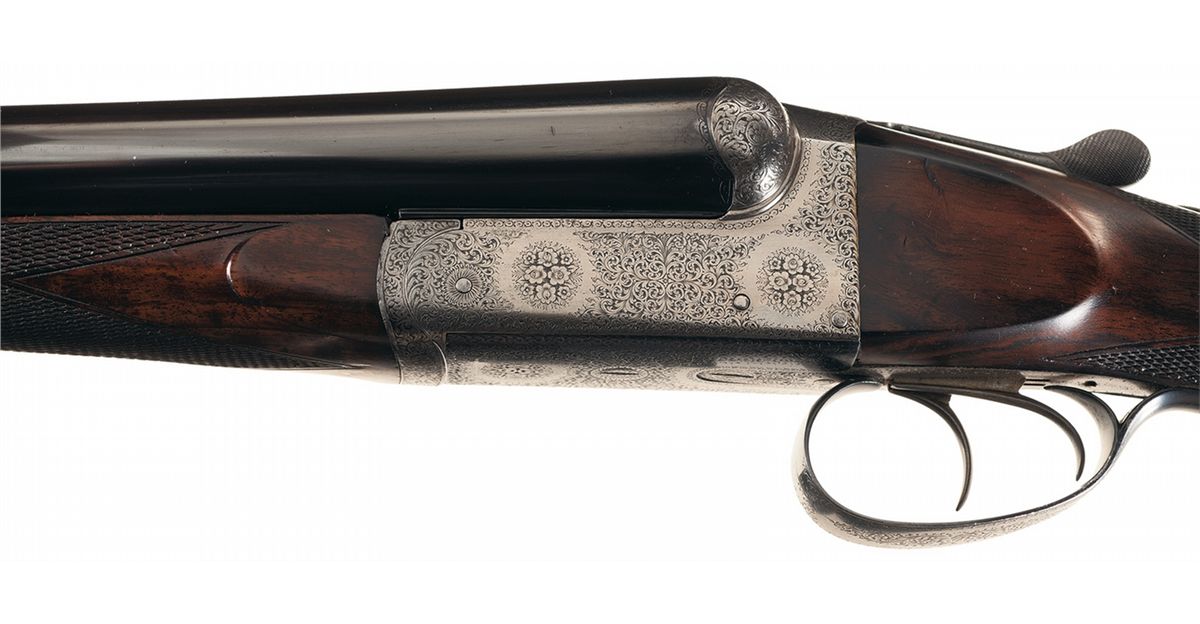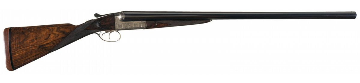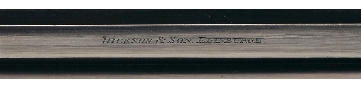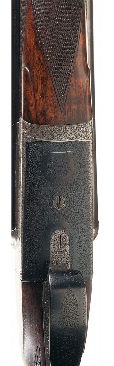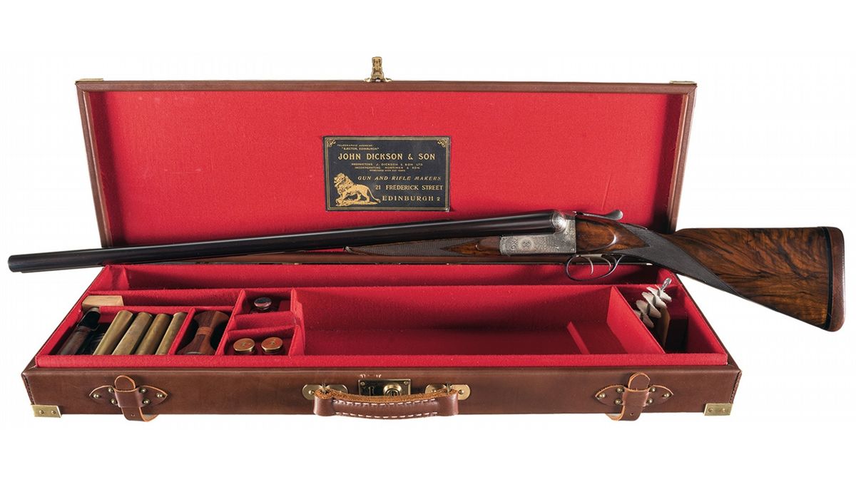 Manufactured circa 1903. Single brass bead sight on the smooth concave solid rib marked "DICKSON & SON EDINBURGH" with fine engraved scrollwork at the breech and on the doll's head extension. 4 inch chambers with extractor. The barrel flats are marked with a "crown" over "BP", "BV" and "NP" proofmarks, "NITRO PROOF" "2 3/4 OZ.", "9/2" "8/C" in a diamond, "CHOKE" and "4". The water table is marked with the matching serial number and a "crown/BV" proofmark on the right side and a "crown/BV" and "J.D&S" on the left side. The forearm hardware is also numbered to the gun. The receiver is engraved with floral scroll designs and rose bouquets. The floral scroll design extends to the trigger guard, break lever, the lower receiver plate and forearm hardware. The receiver is casehardened and the remaining parts are blue. Mounted with a multi-point checkered highly figured deluxe walnut splinter forearm and straight grip stock with a leather covered recoil pad and silver initial oval. Length of pull is 14 inches. The shotgun comes in a hard leather case with brass corner protectors, leather straps and a leather carrying handle. The lining is red felt and there is a John Dickson & Son label affixed to the inside of the lid. In the case is a two-piece wooden cleaning rod, two bore brushes, a chamber brush, a bore mop, a nickel oiler, a patch cutter, two brass snap caps and 4 brass 8 gauge casings. 4 inch chambers, length of pull: 14 1/8 inches, drop at comb: 1 9/16 inches, drop at heel: 2 1/8 inches, cast-off: 1/4 inches, weight: 11lbs 10oz.