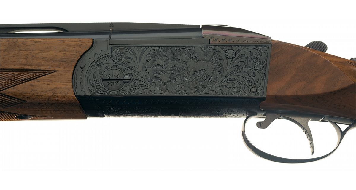 Manufactured in 1966. The receiver is engraved with three ducks in a marsh scene on the right side and a dog pointing at two flushing grouse on the left side. The remainder of the receiver is engraved with floral scroll designs. The barrels have a white bead front sight, a steel mid bead sight, are choked .012/.030, both barrels are ported and the chambers are 2 3/4 inches with long forcing cones and ejectors. The hanger is unmarked but is very short. Mounted on a nicely figured, multi-point checkered walnut forearm with finger grooves and a pistol grip stock with dual palm swell (more pronounced on left side) and a G Squared Shockmaster recoil reducer with leather covered comb and Pachmayr recoil pad. Length of pull is 14 1/2 inches. With a Krieghoff branded Americase, stock removal Allen wrench and some grease.