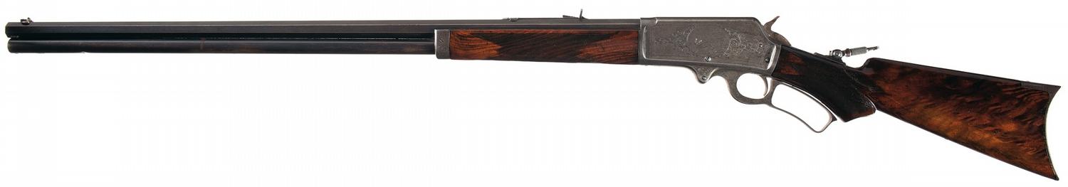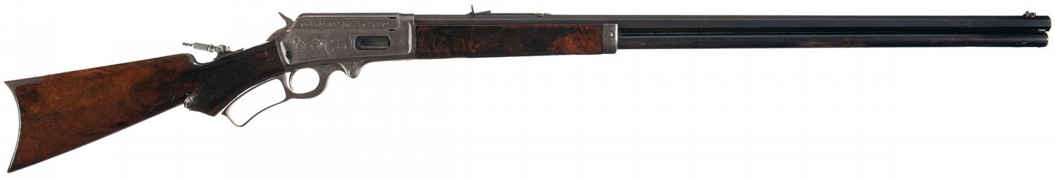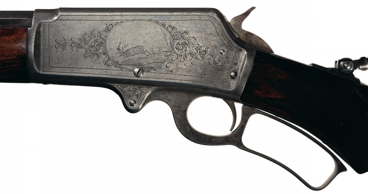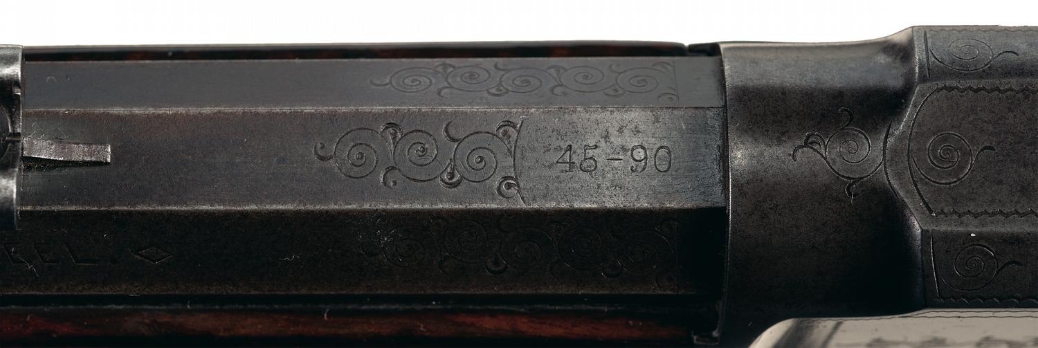 This rifle manufactured in late 1898. The top barrel is marked "MARLIN FIRE-ARMS CO. NEW-HAVEN, CT. U.S.A. / PATENTED. OCT. 11. 1887, APRIL 2. 1889, AUG. 1, 1893." ahead of the rear sight and "45-90" at the breech, with "SPECIAL SMOKELESS STEEL" on the upper left flat. The top of the receiver is marked "MARLIN SAFETY". The left side of the receiver is engraved with a dog chasing a deer in an oval panel flanked by floral scroll and punch dot engraving, and with a double scallop border. The right side has an intertwined "JS" in a circle, scalloped borders and simple scroll on the bolt. The breech end barrel flats have a wedge of simple scroll engraving. Folding globe front, adjustable buck horn rear and tang mounted short range peep sights. Blue barrel and magazine with casehardened remaining parts, and mounted with a checkered walnut forearm with iron end cap and pistol grip stock with crescent buttplate. Blue barrel assembly with the remaining surfaces casehardened. Mounted with a checkered forearm and pistol grip stock with a crescent steel buttplate.